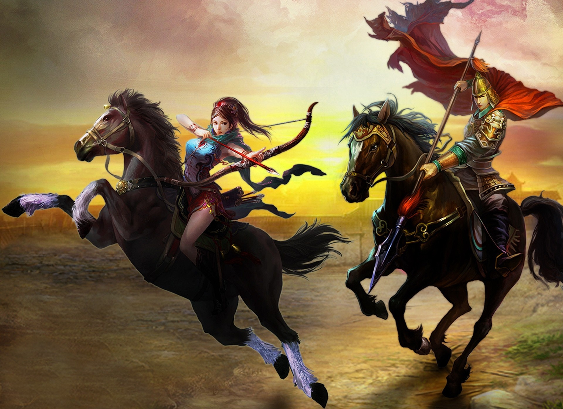 Arte chica y jinete con arco y lanza galopan a caballoArte chica y jinete con arco y lanza galopan a caballo