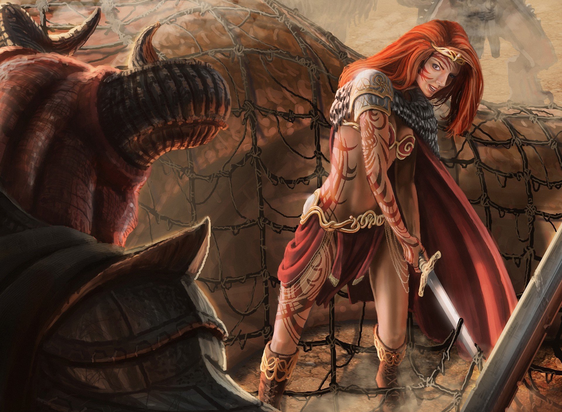 La chica con la espada mira hacia la criatura con cuernosLa chica con la espada Mira hacia la criatura con cuernos