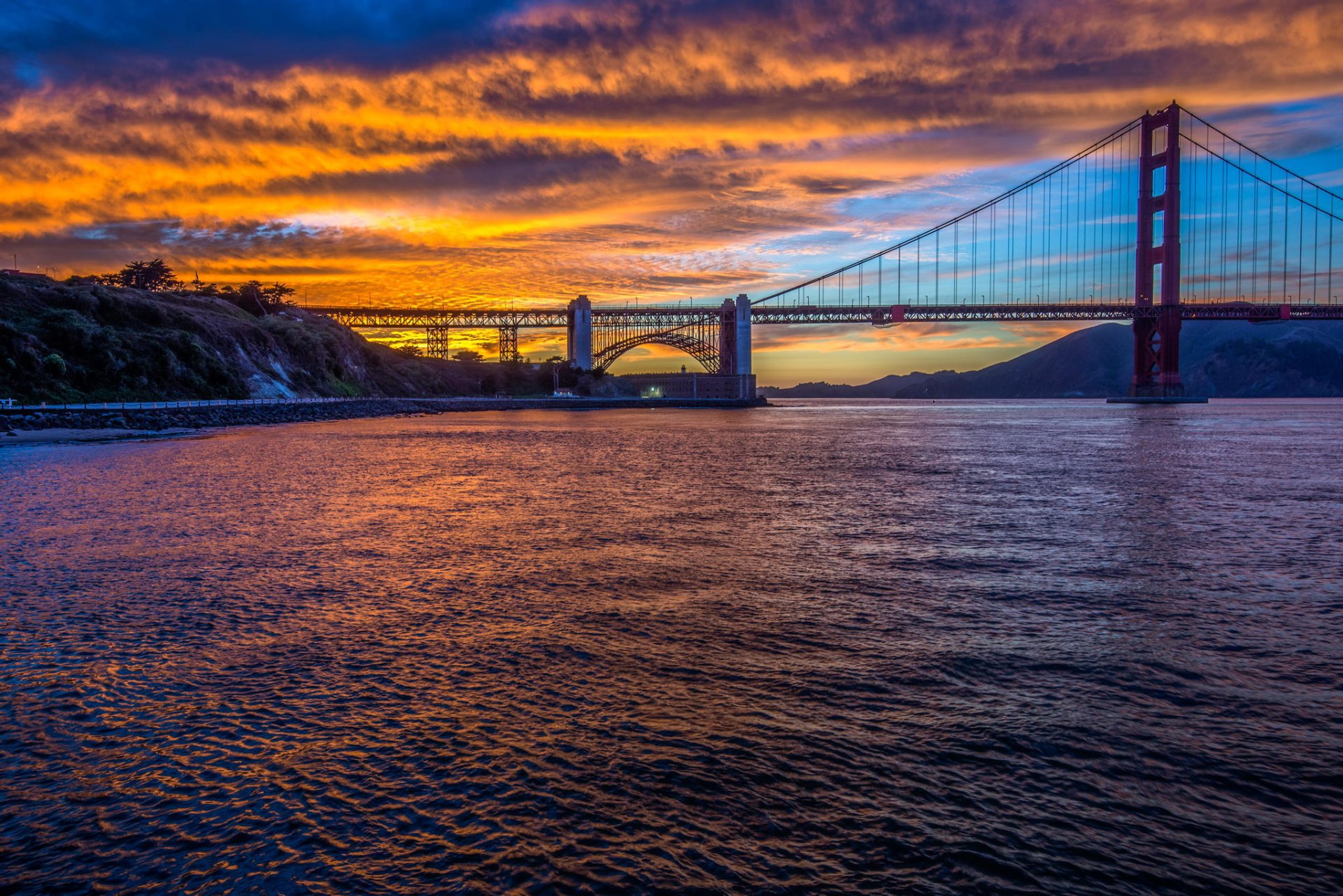 Puente golden gate en san francisco, durante la marea alta, en tonos azul y lilaPuente Golden Gate en San Francisco, durante la marea alta, en tonos azul y lila