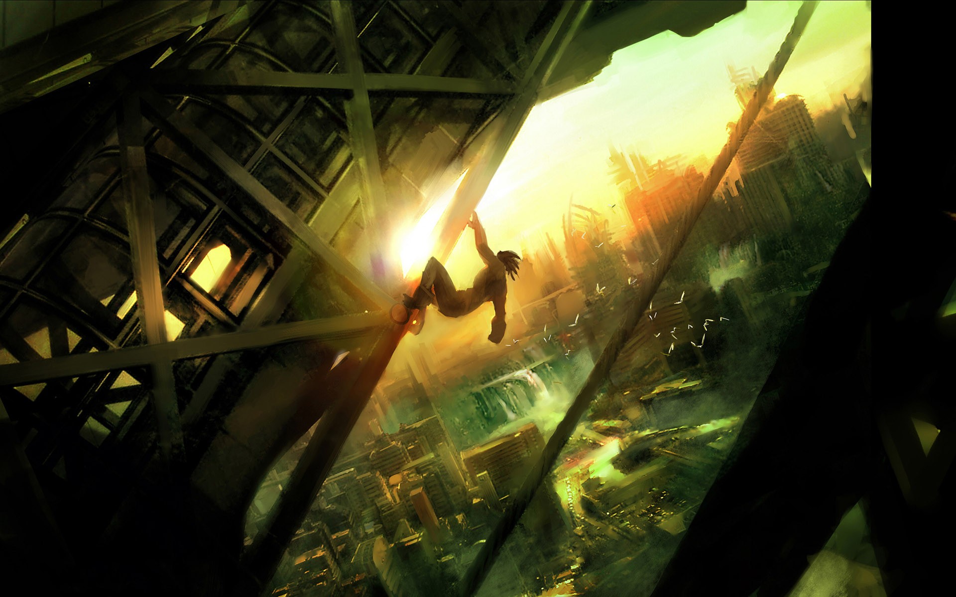 Los pájaros vuelan sobre la ciudad. el sol se poneLos pájaros vuelan sobre la ciudad. El sol se pone