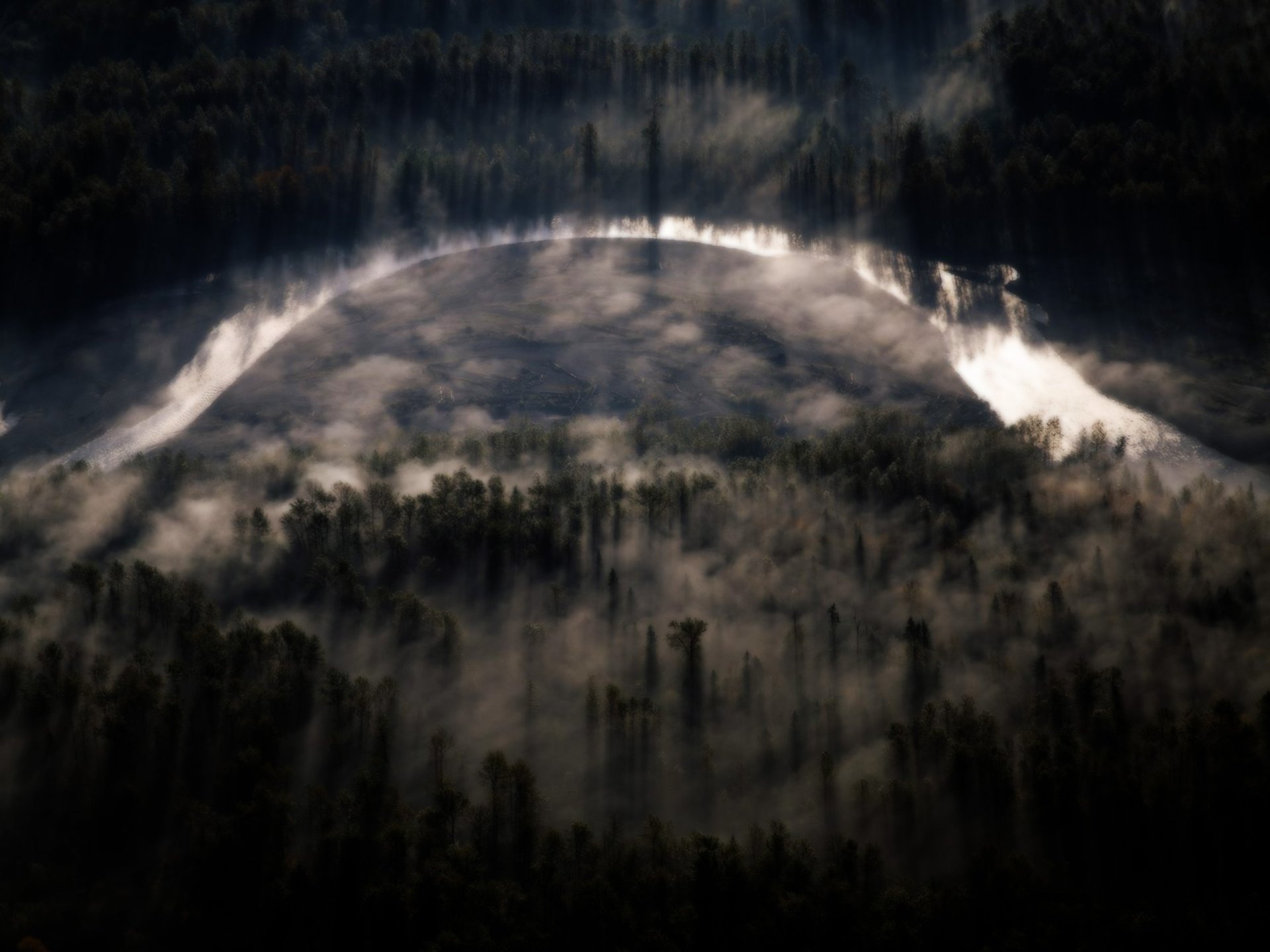 Sobre el río y el denso bosque se extiende la nieblaSobre el río y el denso bosque se extiende la niebla