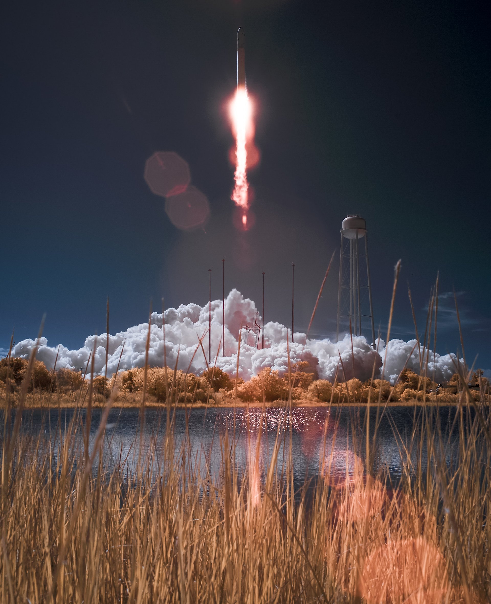 El despegue de un cohete en el fondo de un lago y espigasEl despegue de un cohete en el fondo de un lago y espigas
