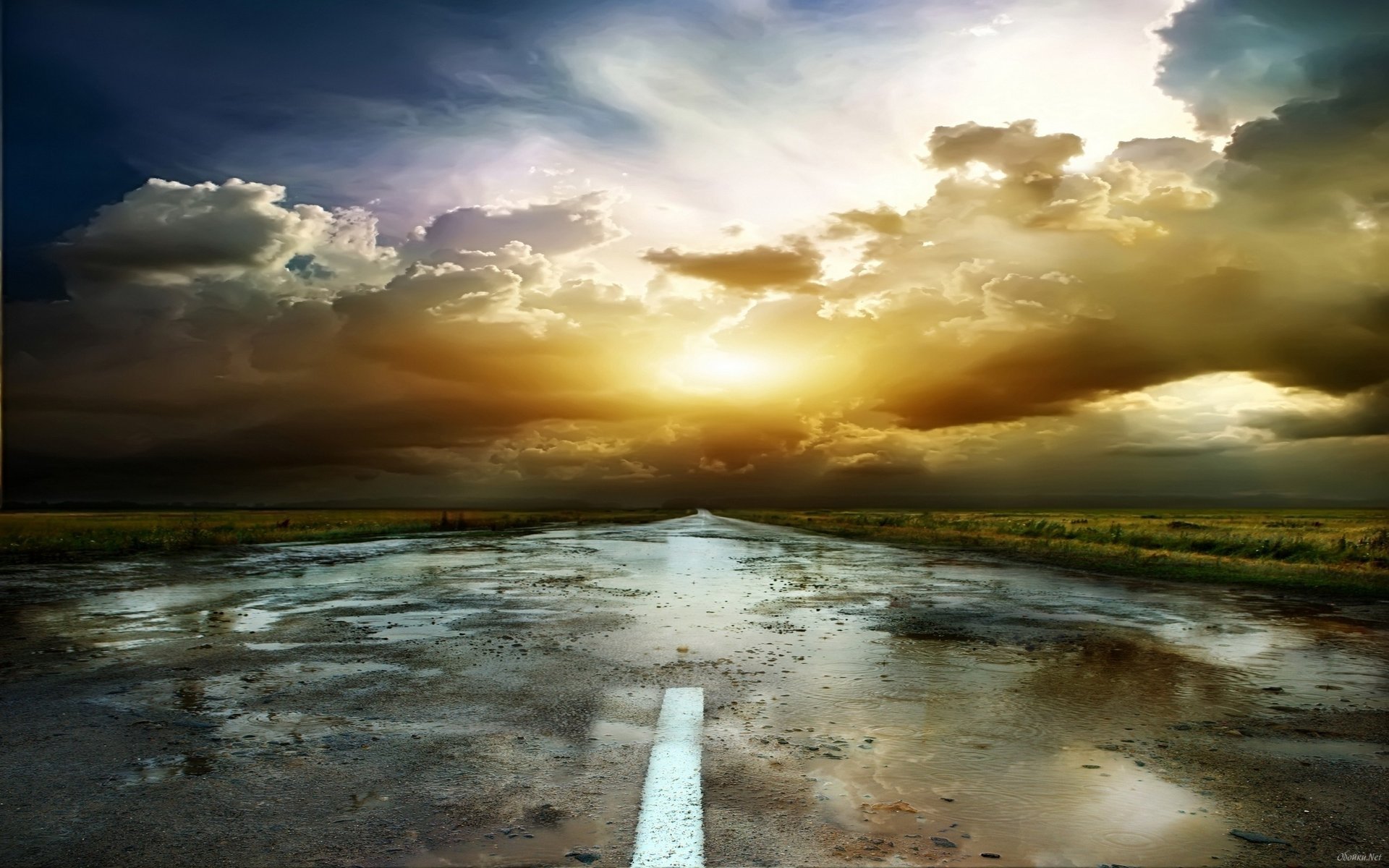 Un camino con charcos al atardecer y el reflejo de los rukasUn camino con charcos al atardecer y el reflejo de los rukas