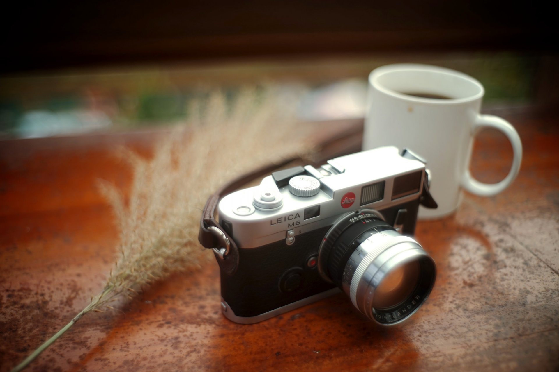 Cámara Leica negra y plateada con un lazo en la mesa con una taza de café