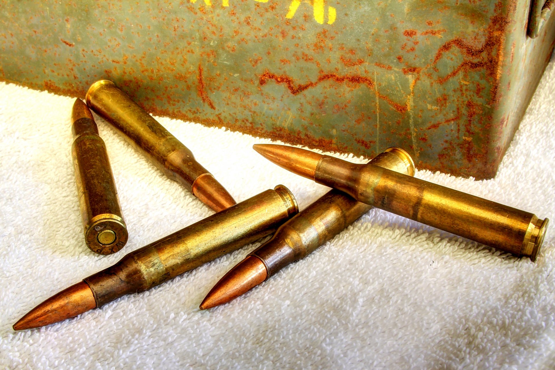 Cinco rondas en un paño de felpa blanco en una caja oxidadaCinco rondas en un paño de felpa blanco en una Caja oxidada