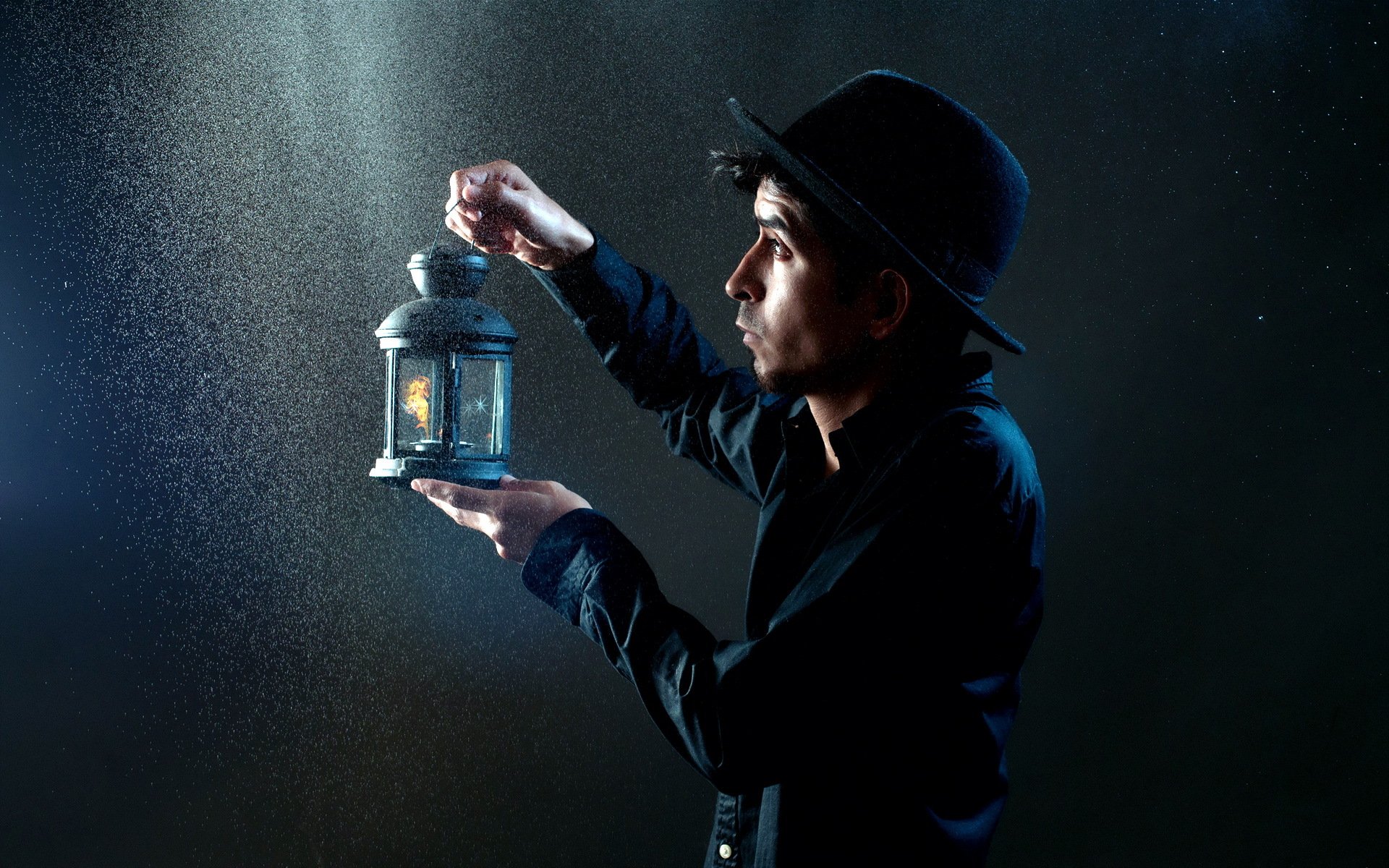 Hombre en la oscuridad con una linterna en la manoHombre en la oscuridad con una linterna en la mano