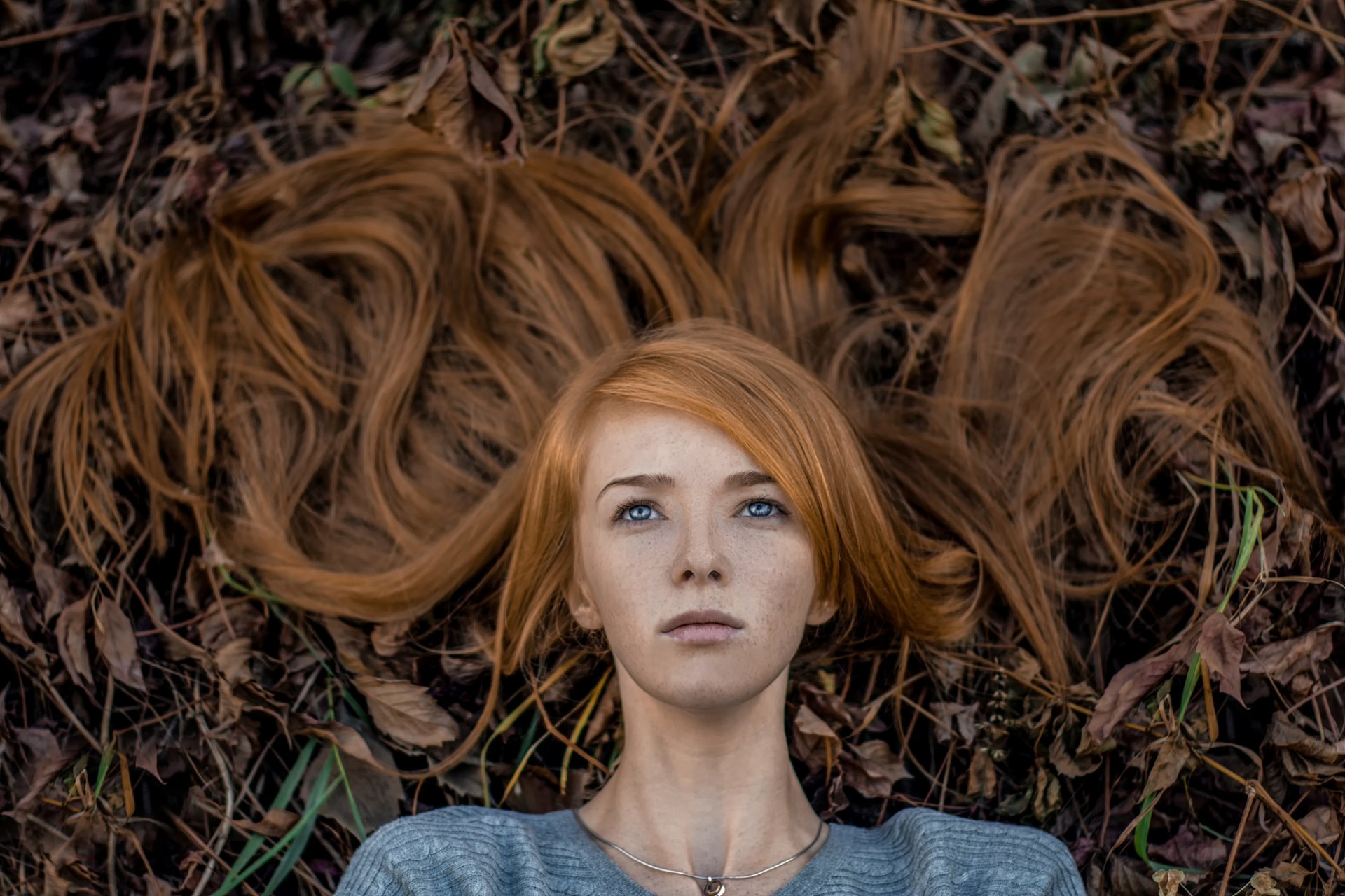 Retrato de una niña con el pelo rojo en el fondo de las hojas caídasRetrato de una niña con el pelo rojo en el fondo de las hojas caídas