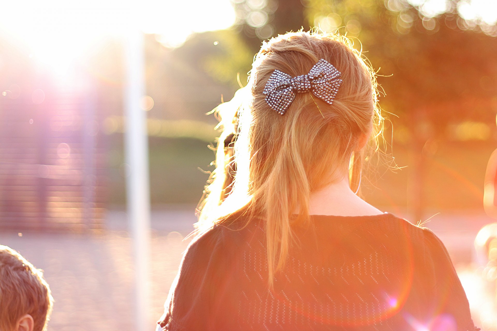 El peinado de una chica con un arco en la luz del solEl peinado de una chica con un arco en la luz del sol