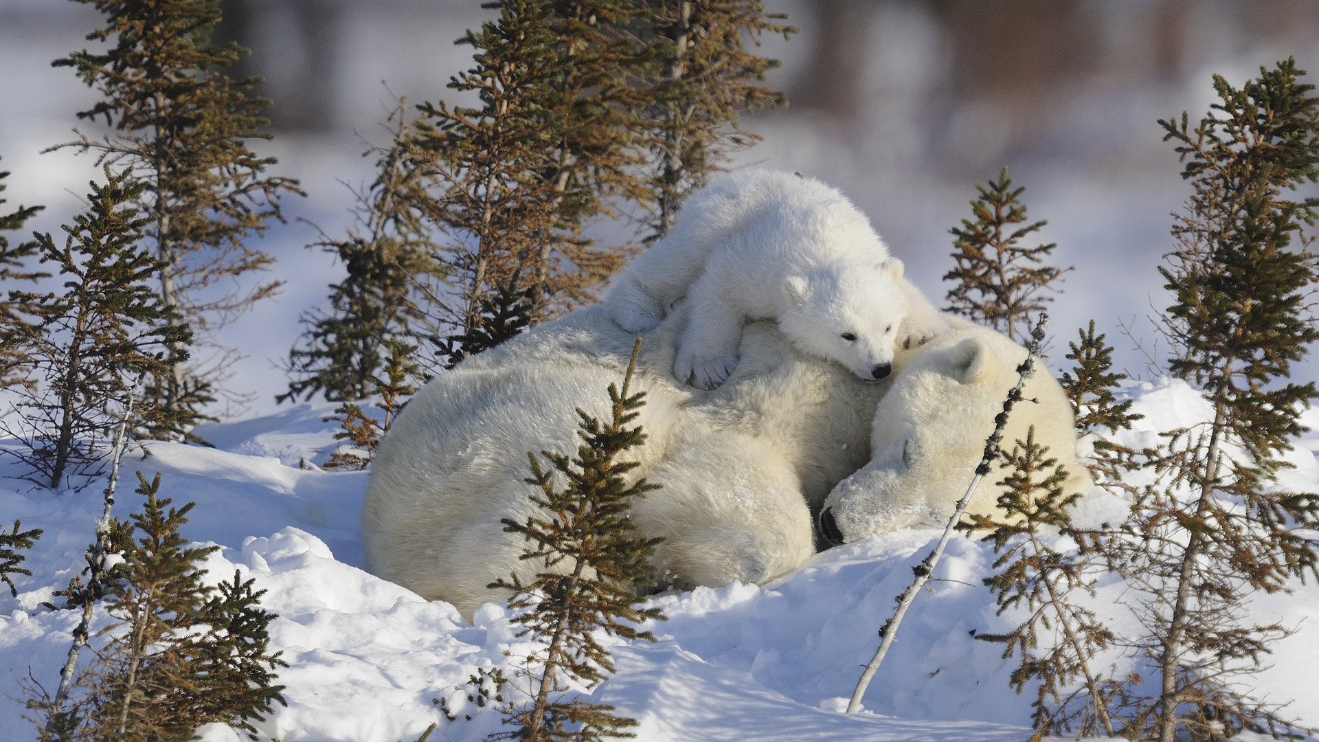 Oso con su madre oso polar descansando en la nieveOso con su madre oso polar descansando en la nieve