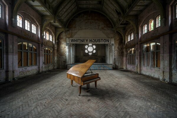 Pelirroja chica con un largo vestido blanco y zapatos de pie sobre el esqueleto en un viejo localPelirroja chica con un largo vestido blanco y zapatos de pie sobre el esqueleto en un viejo local
