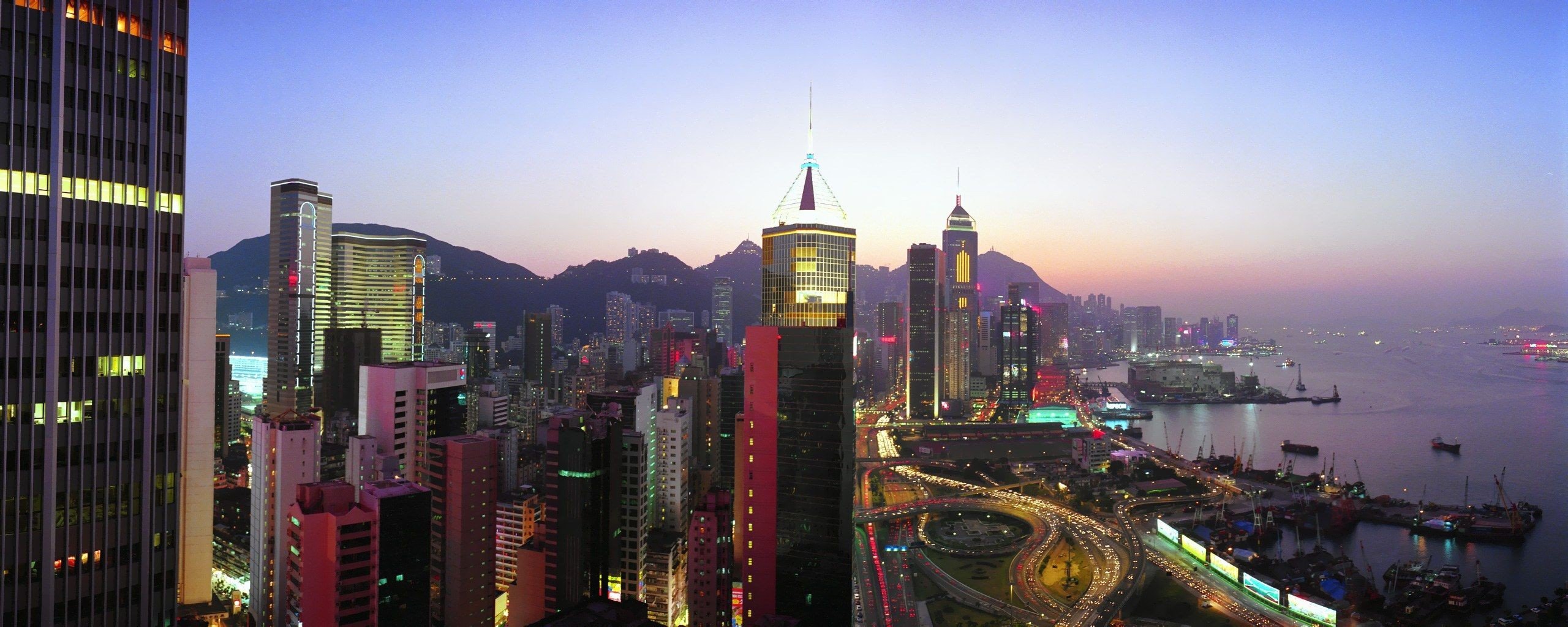 Luces lilas en un puente en taiwán y luces de la ciudad en la distanciaLuces Lilas en un puente en Taiwán y luces de la ciudad en la distancia