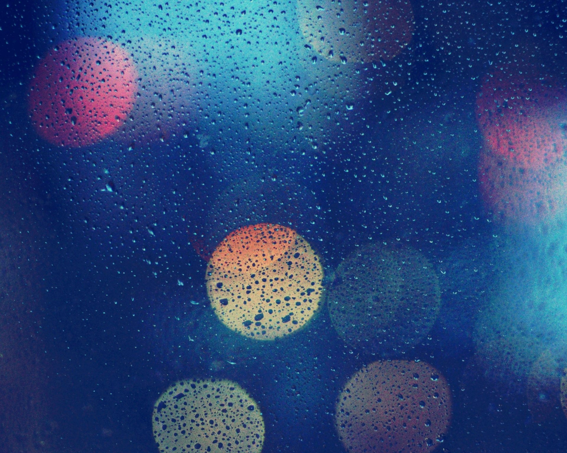En el cristal gotas de lluvia con reflejos de luces de coloresEn el cristal gotas de lluvia con reflejos de luces de colores