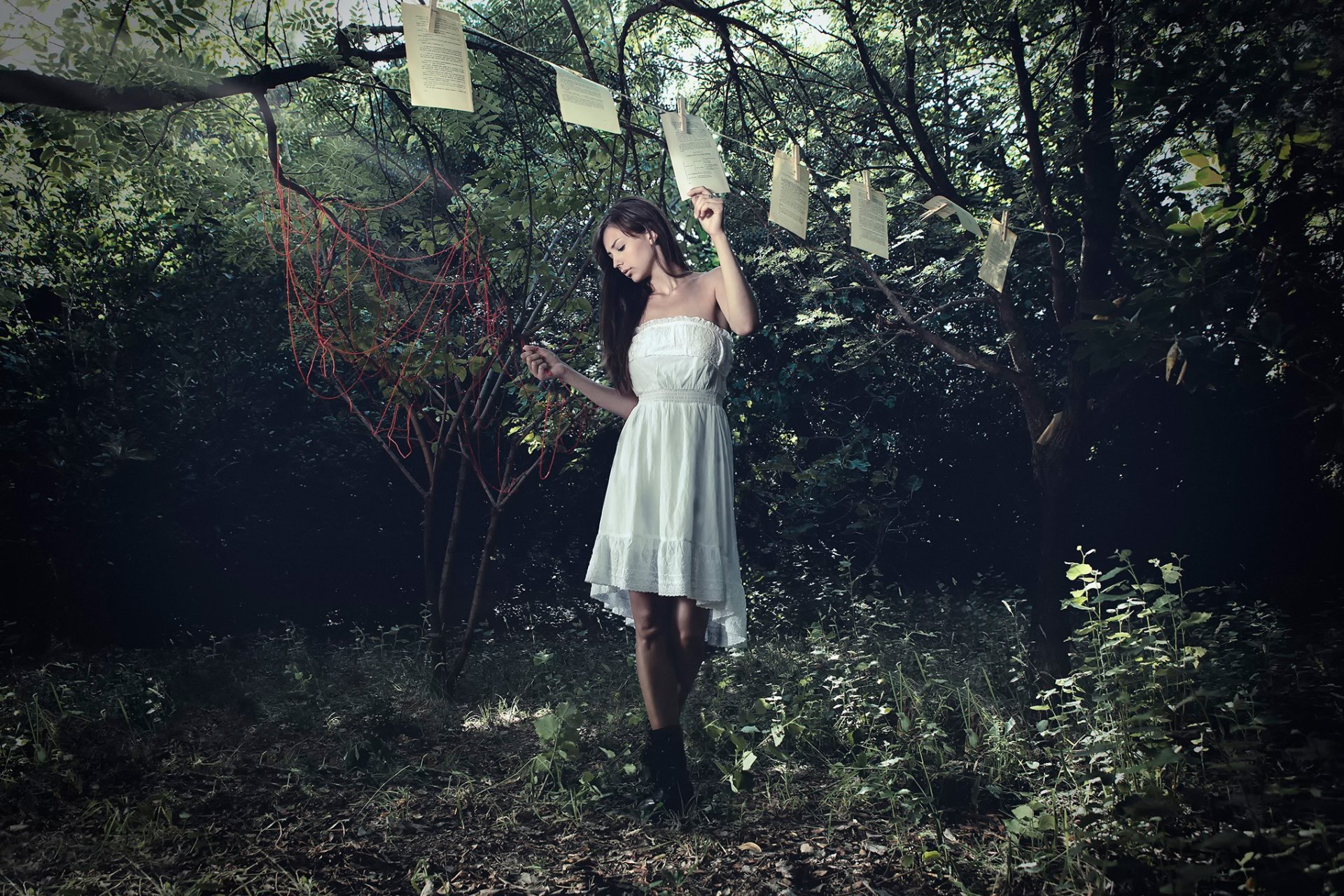 Una chica con un vestido blanco se aferra a una cuerda con pinzas para la ropa las hojas del libro, todo sucede en el bosqueUna chica con un vestido blanco se aferra a una cuerda con pinzas para la ropa las hojas del libro, todo sucede en el bosque