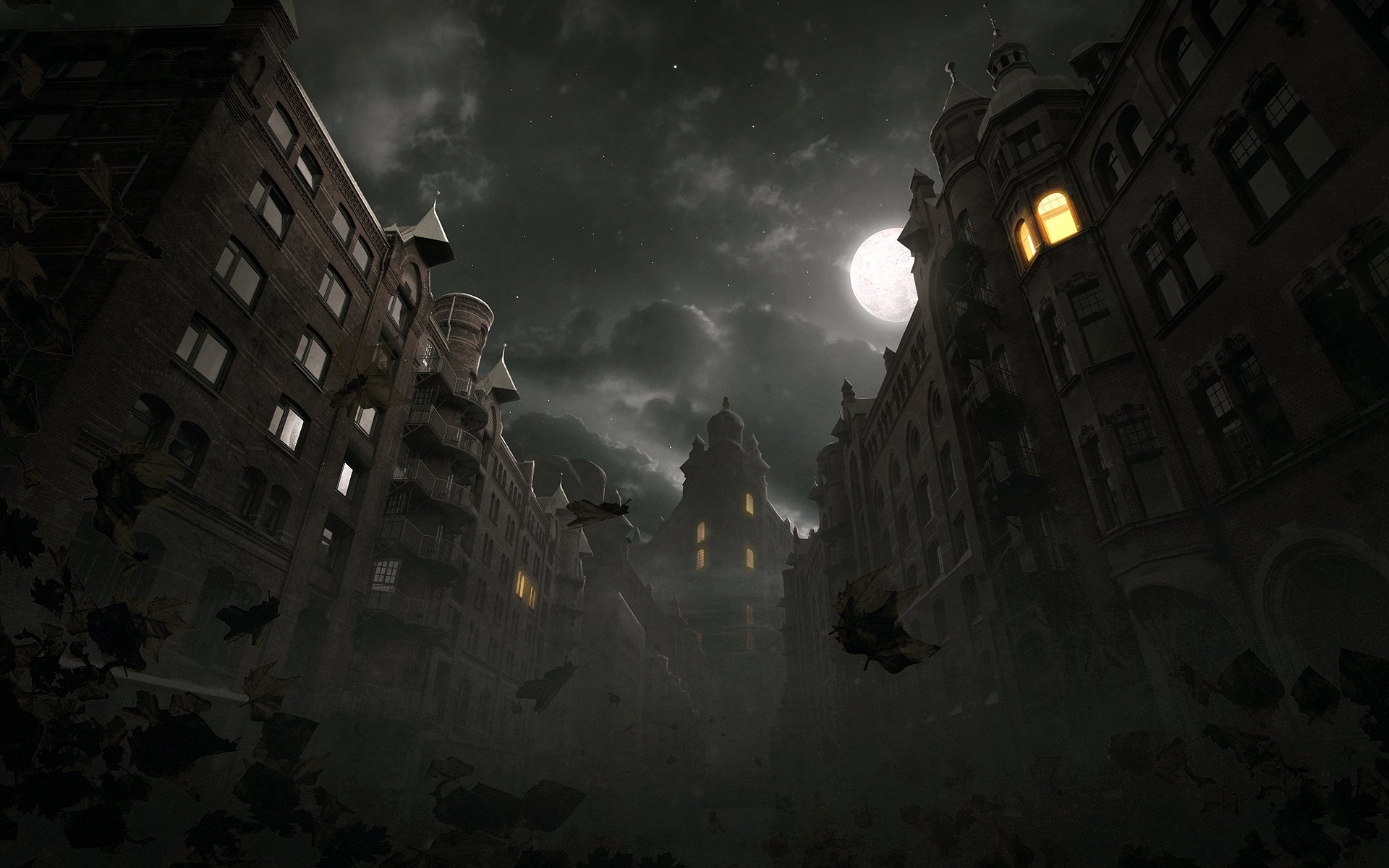 Luna llena, hojas cayendo y luces encendidas en la ventanaLuna llena, hojas cayendo y luces encendidas en la ventana