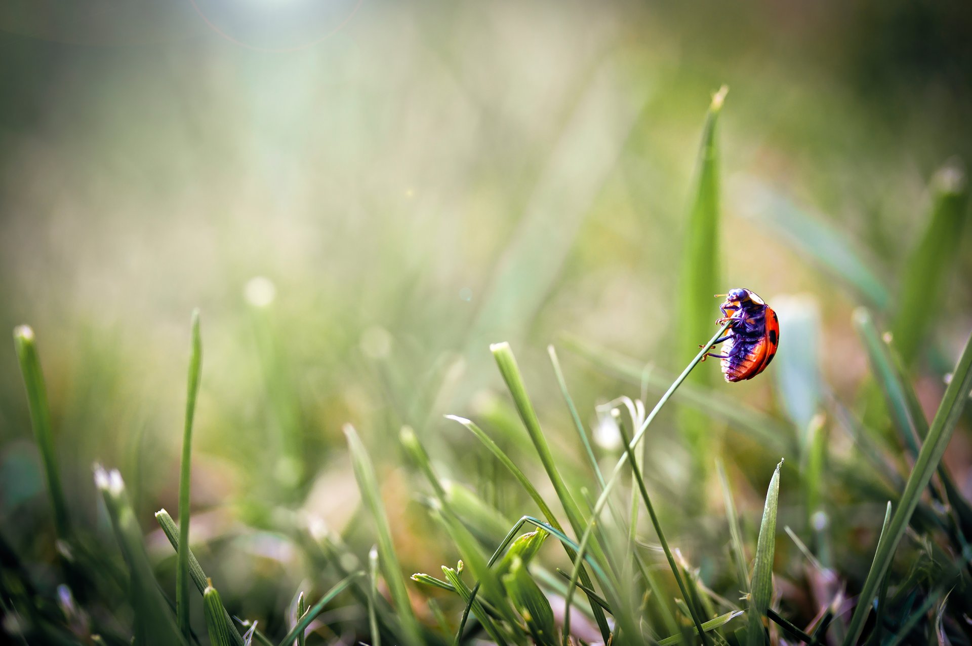 Una mariquita se arrastra sobre la hierba y trata de despegarUna mariquita se arrastra sobre la hierba y trata de despegar
