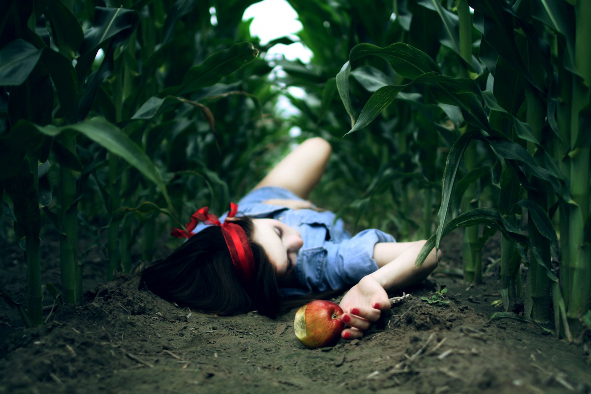 Chica con una manzana tendida en un campo