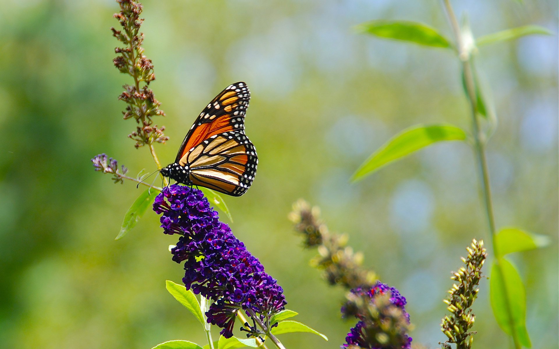 Fotografía macro de una mariposa sobre un fondo de flores púrpurasFotografía macro de una mariposa sobre un fondo de flores púrpuras