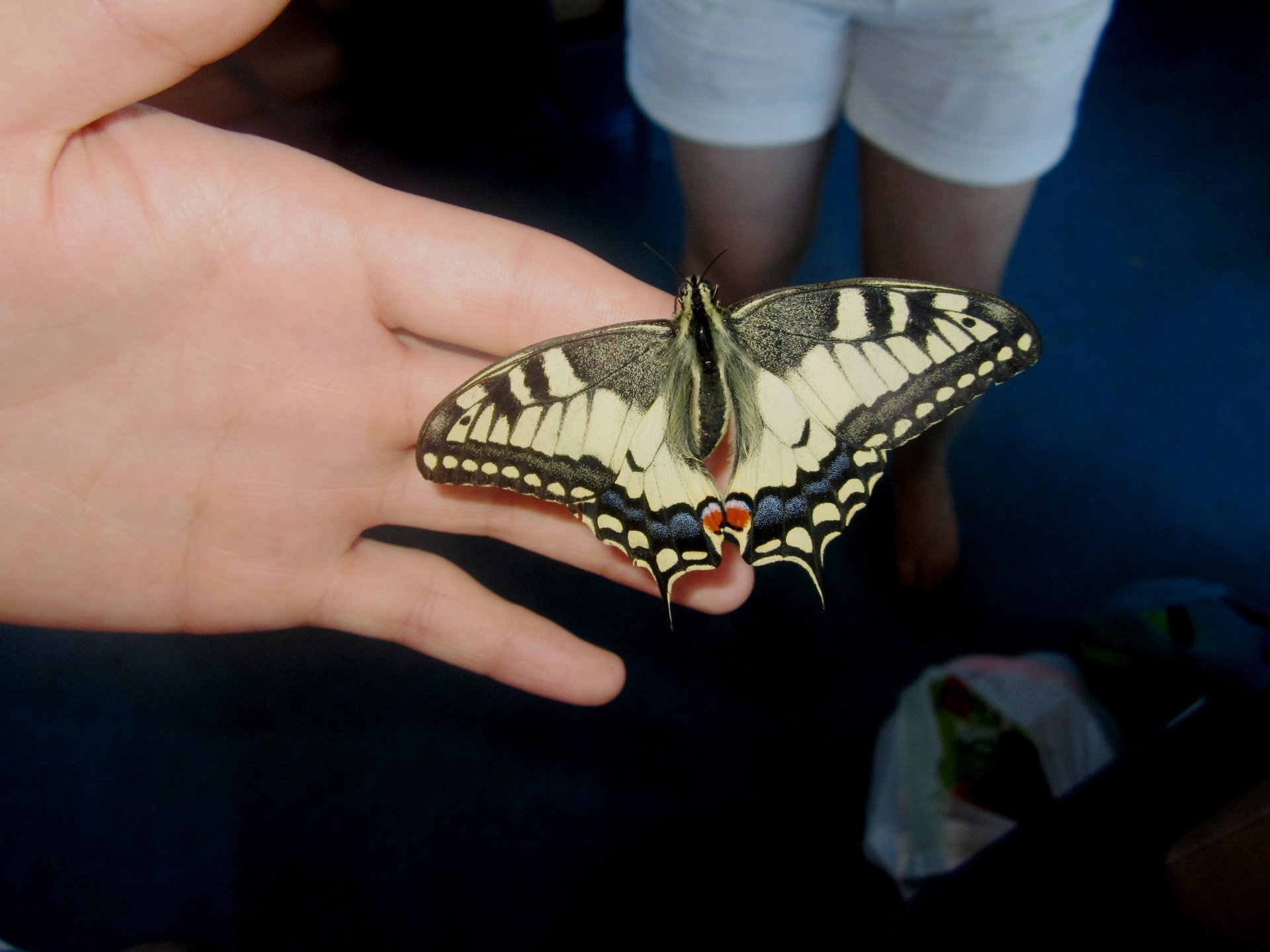 Hermosa mariposa en la mano del hombre