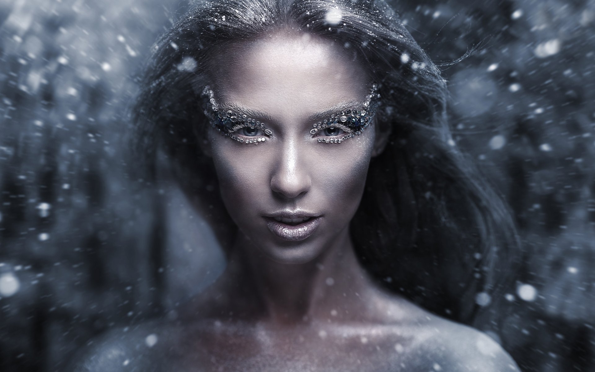 Retrato de una niña en un bosque cubierto de nieve
