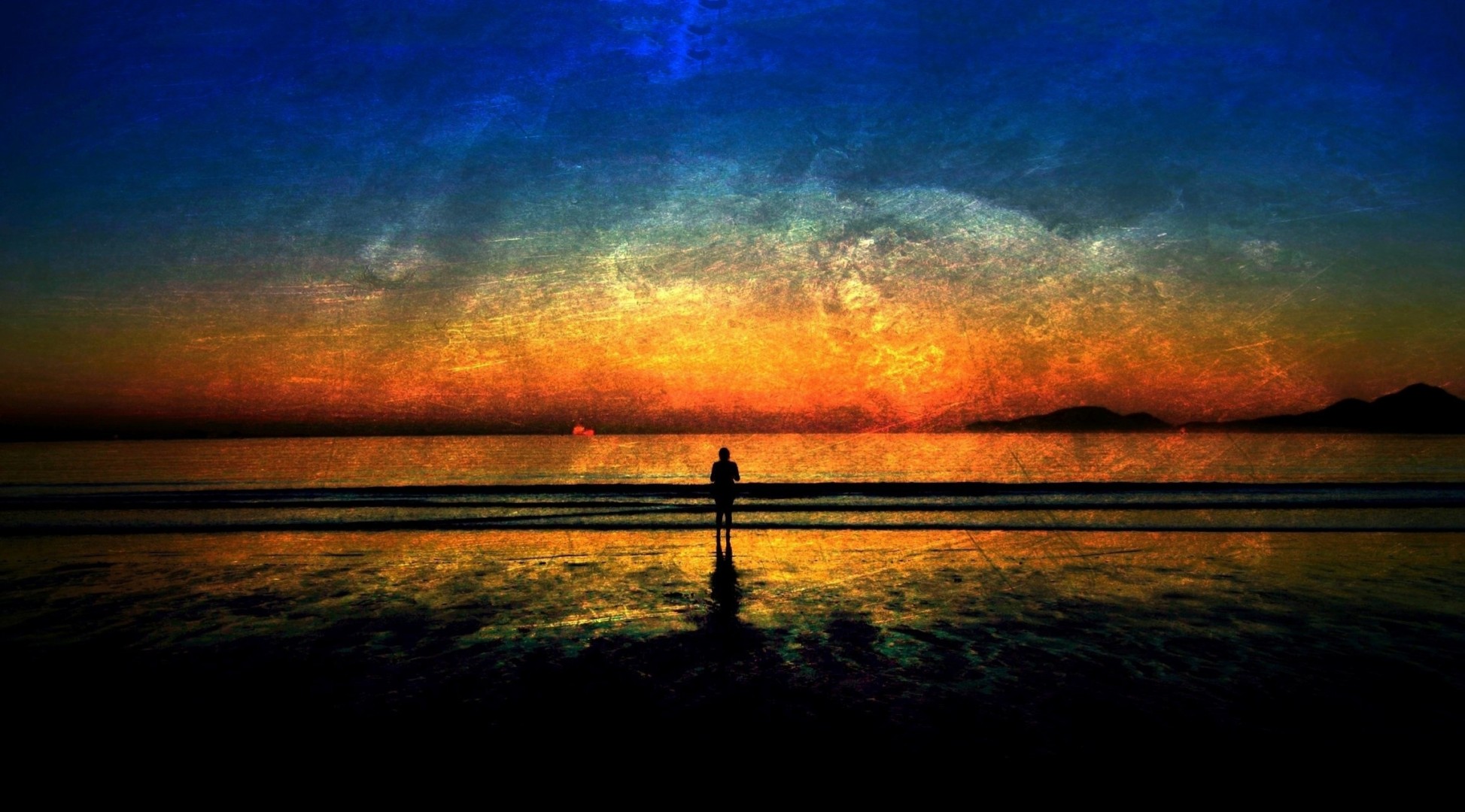 Dibujo de un hombre solitario en la orilla del mar. atardecerDibujo de un hombre solitario en la orilla del mar. Atardecer