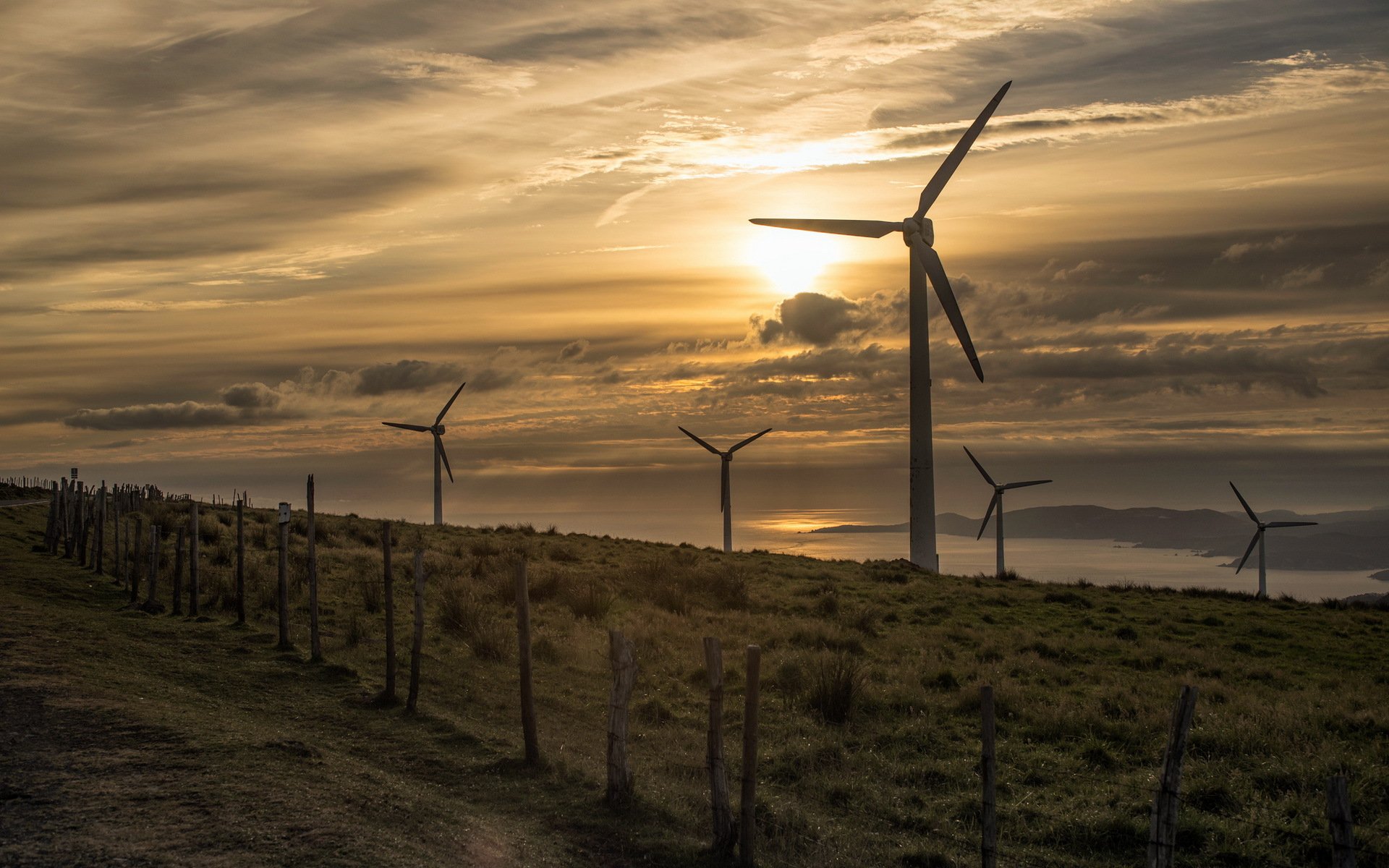 Molinos de viento en el fondo de una puesta de sol rosaMolinos de viento en el fondo de una puesta de sol rosa