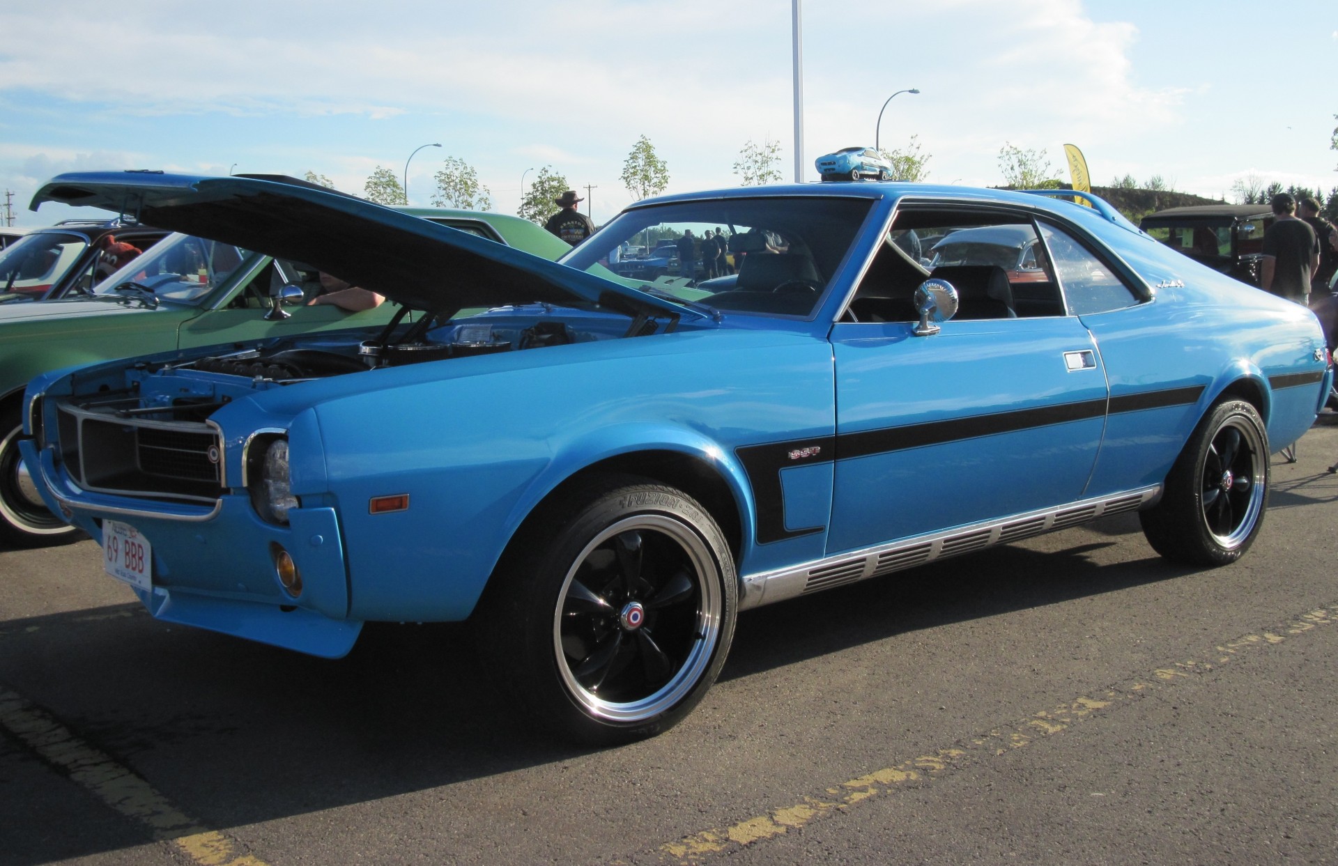 Coche azul con capucha abierta y una franja negra en la carrocería