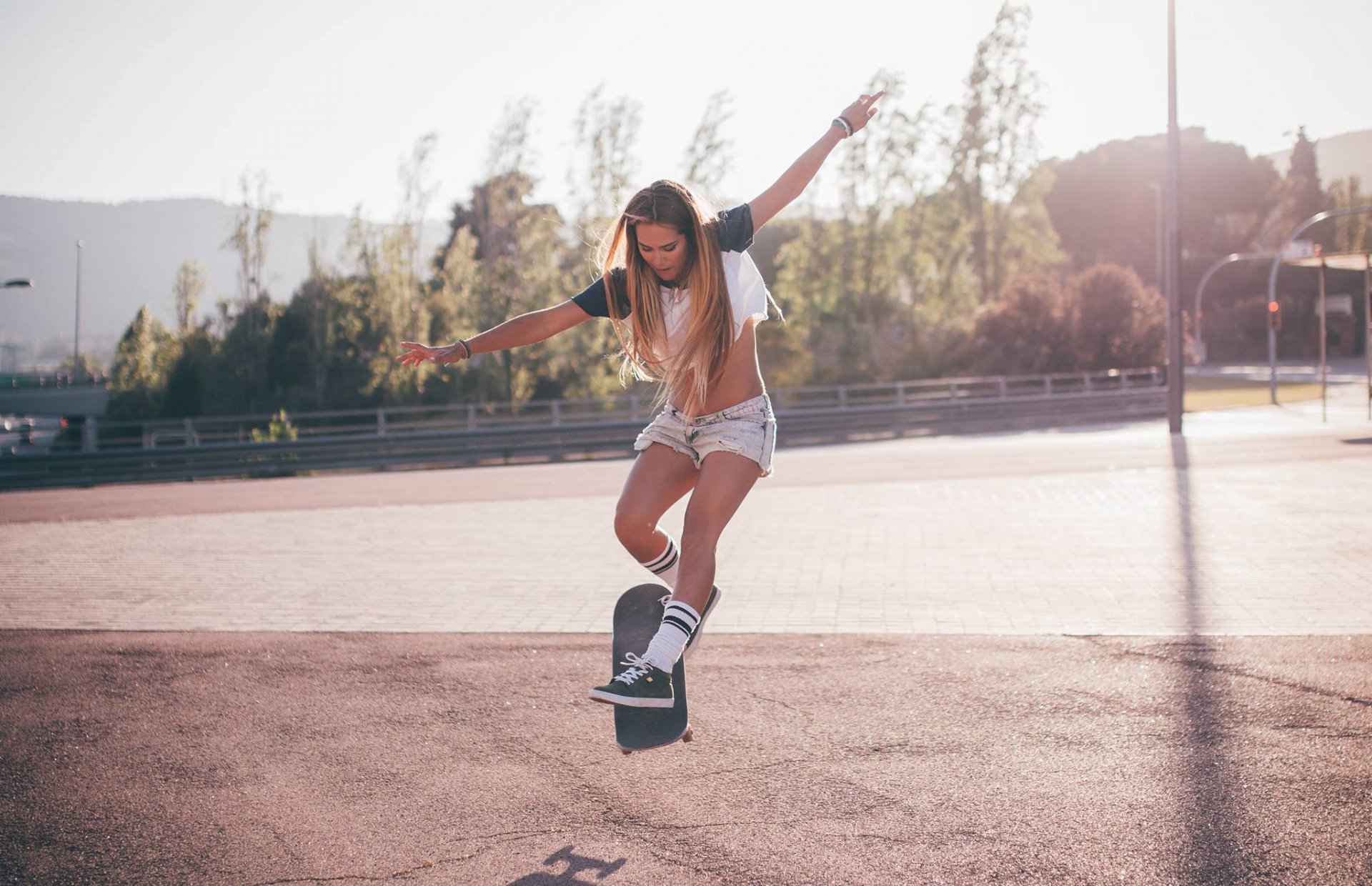 Chica deportiva rubia con tom verde y pantalones cortos negros contra el bosque y el cielo nubladoChica deportiva rubia con Tom verde y pantalones cortos negros contra el bosque y el cielo nublado