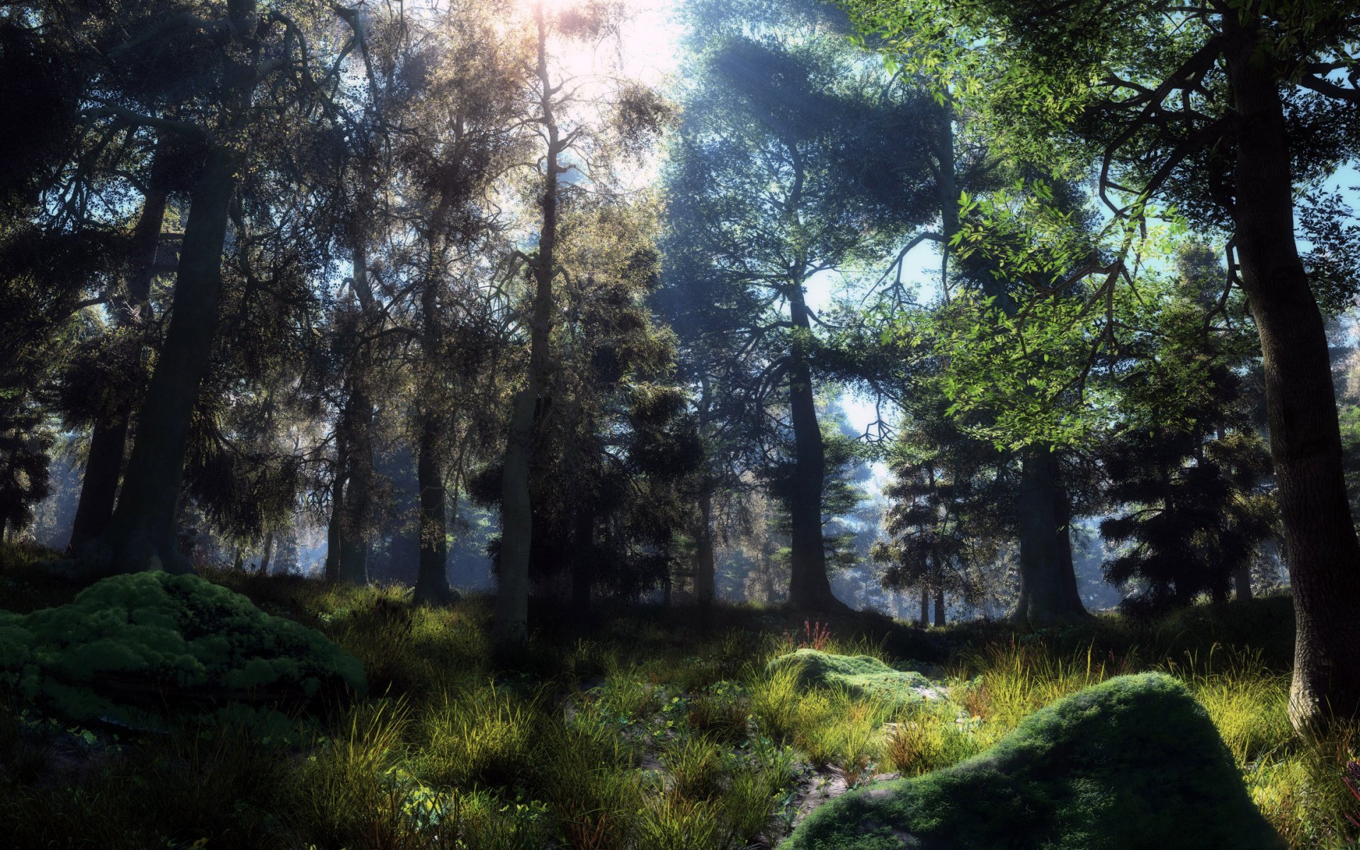 Musgo árboles y rocas en el bosque a la luz del solMusgo árboles y rocas en el bosque a la luz del sol