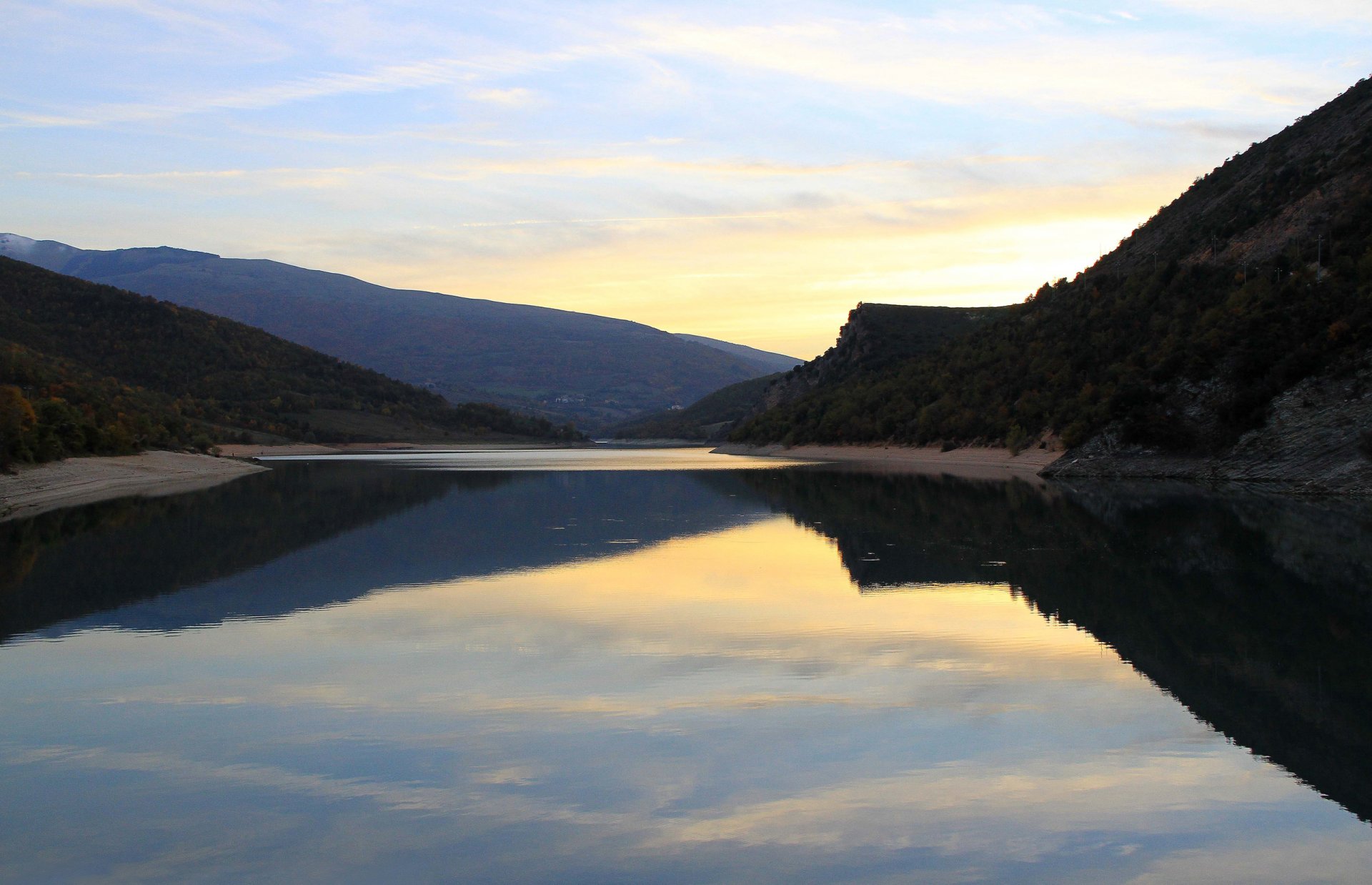 Puesta de sol vespertina y montañas que se reflejan en el lagoPuesta de sol vespertina y montañas que se reflejan en el lago