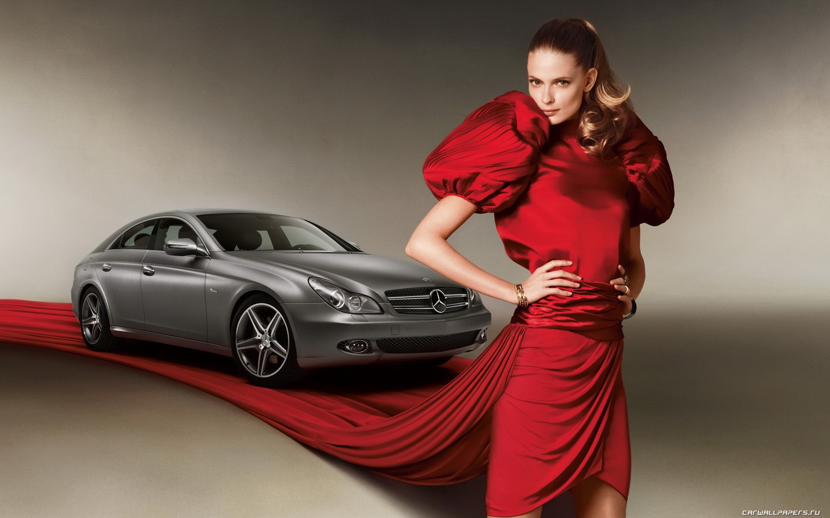 Modelo con vestido rojo en el fondo del coche de mercedesModelo con vestido rojo en el fondo del coche de Mercedes