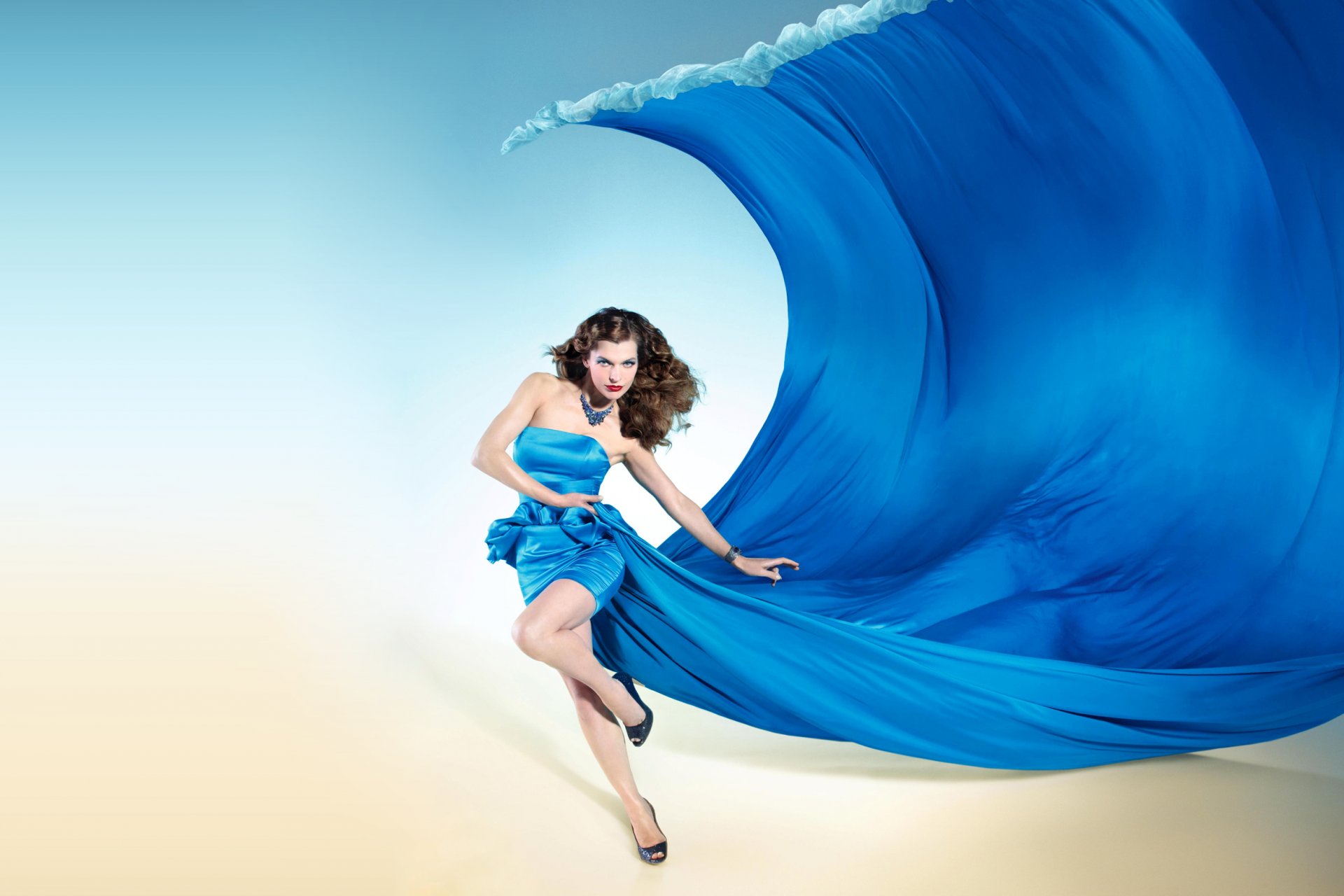 Una chica con un vestido azul cuyo dobladillo parece una olaUna chica con un vestido azul cuyo dobladillo parece una ola