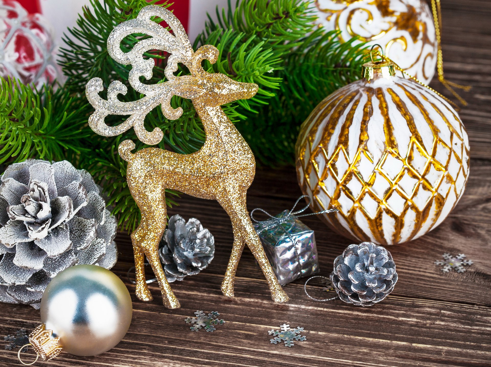 Regalo de año nuevo, estrellas y bola de navidad en una escala de oro sobre un fondo blancoRegalo de año nuevo, estrellas y bola de Navidad en una escala de oro sobre un fondo blanco