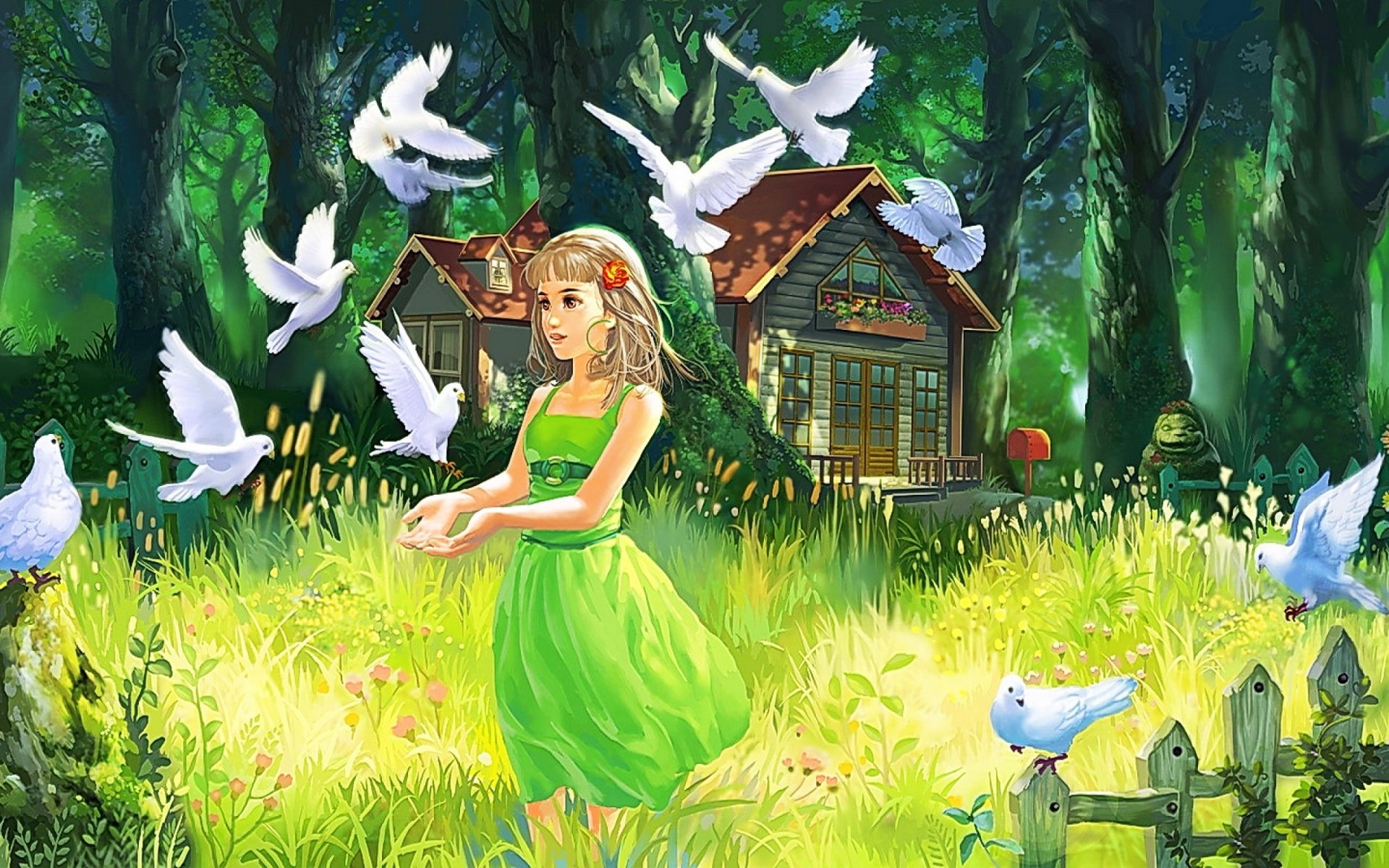 Imagen de una chica con un vestido verde con palomasImagen de una chica con un vestido verde con palomas