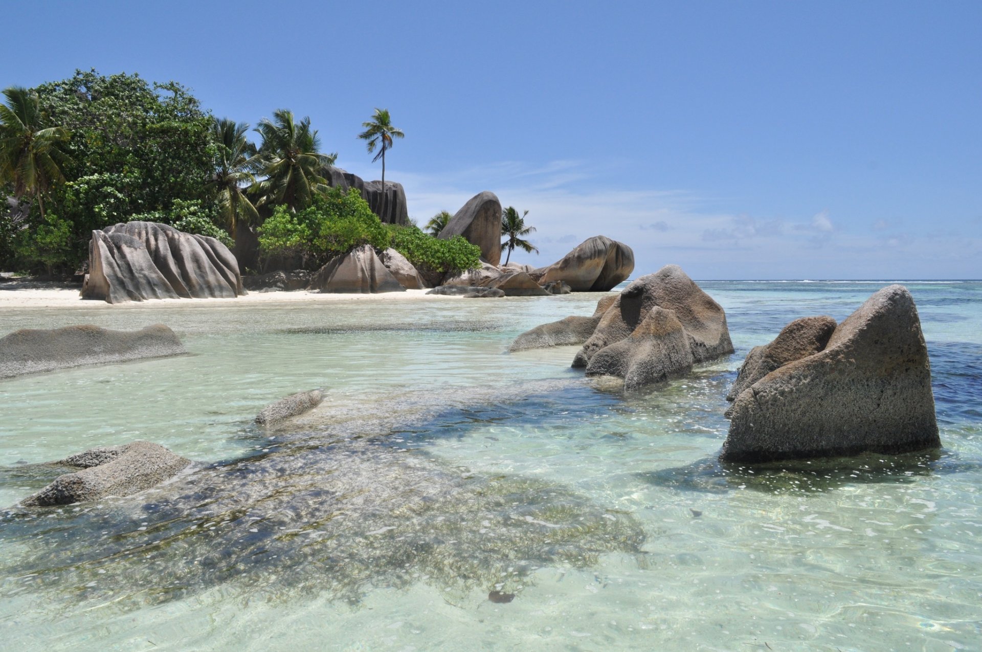 Playa tropical con agua azul y palmeras