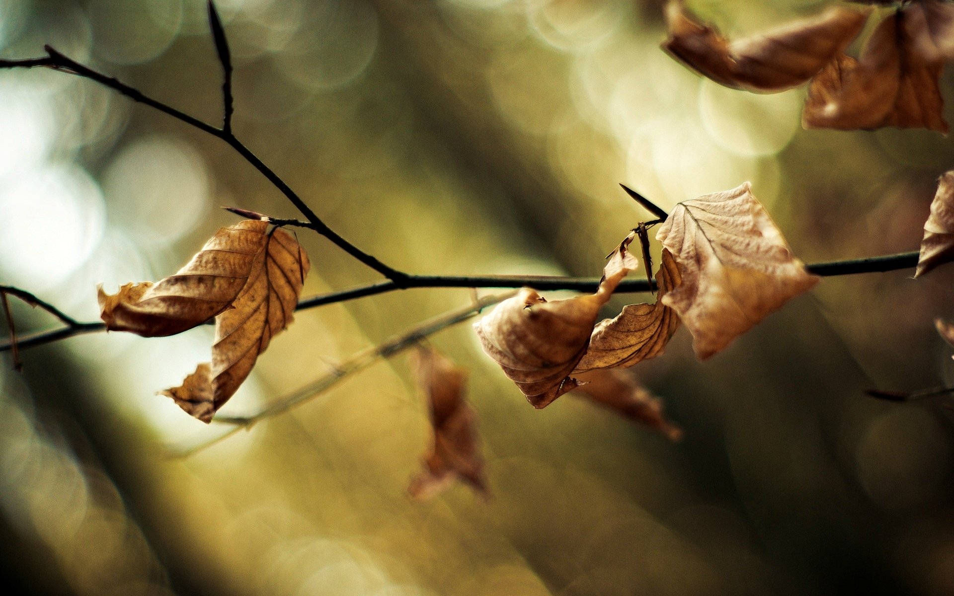 Papel pintado de gran formato con hojas secas en una rama y bokeh borrosoPapel pintado de gran formato con hojas secas en una rama y bokeh borroso