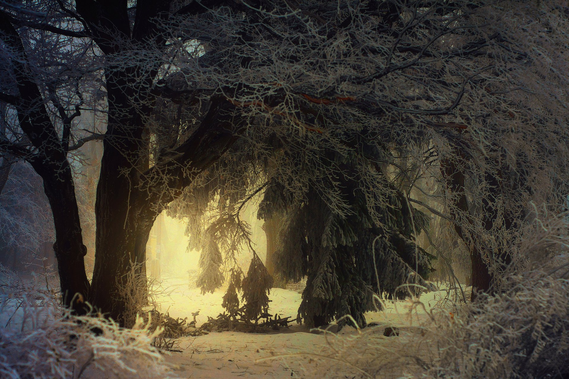 Parque de invierno cubierto de escarcha. Luz brillante en el bosque de invierno