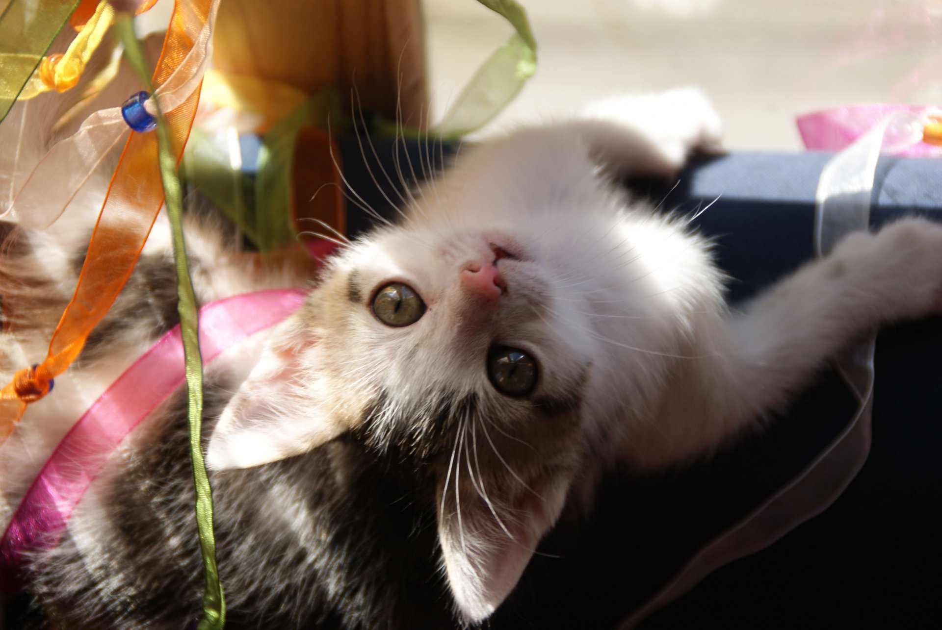 Gatito gris se cae juguetonamente de la casa del gato boca abajo