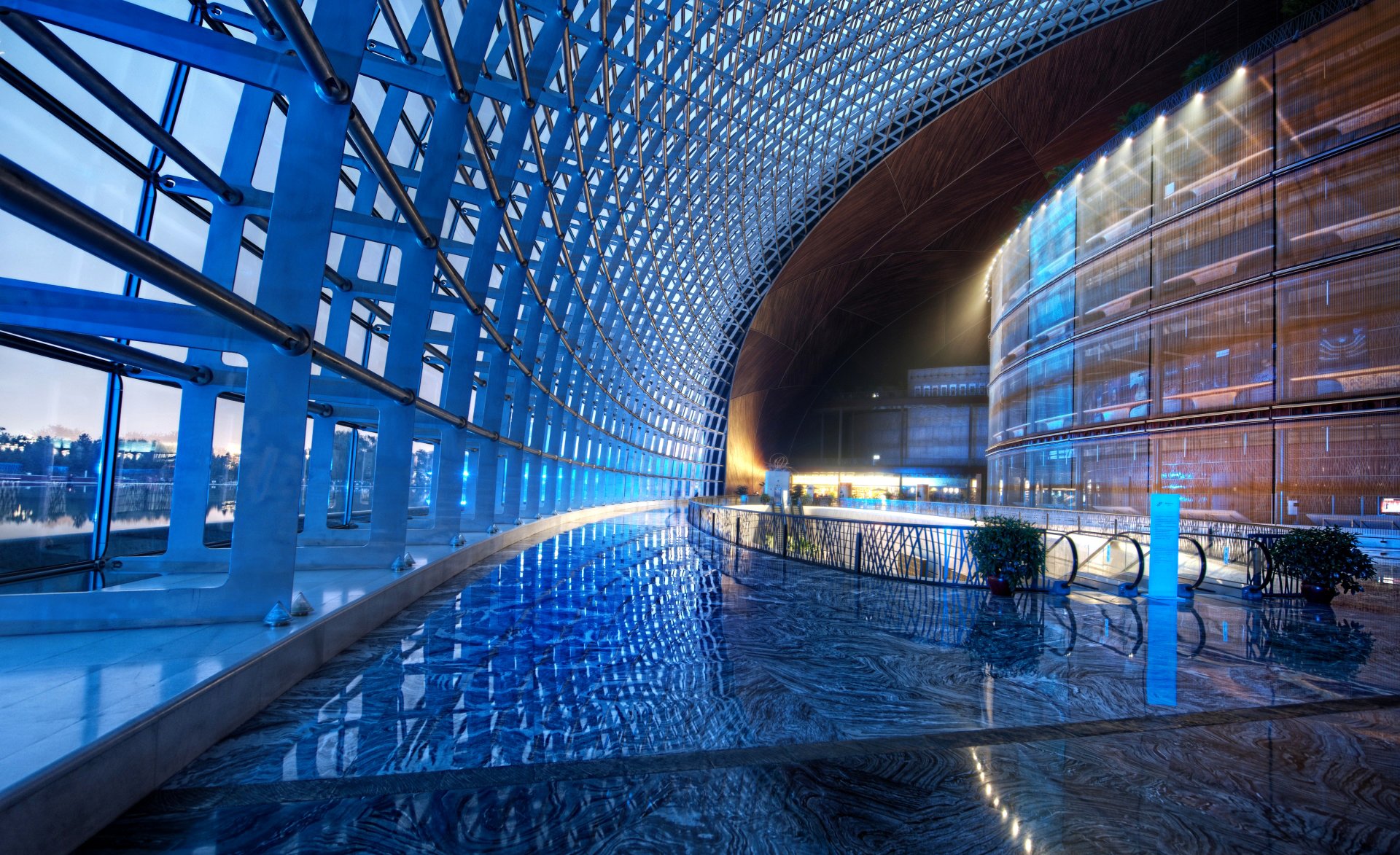 Hermoso interior con chimenea en el vestíbulo del hotel