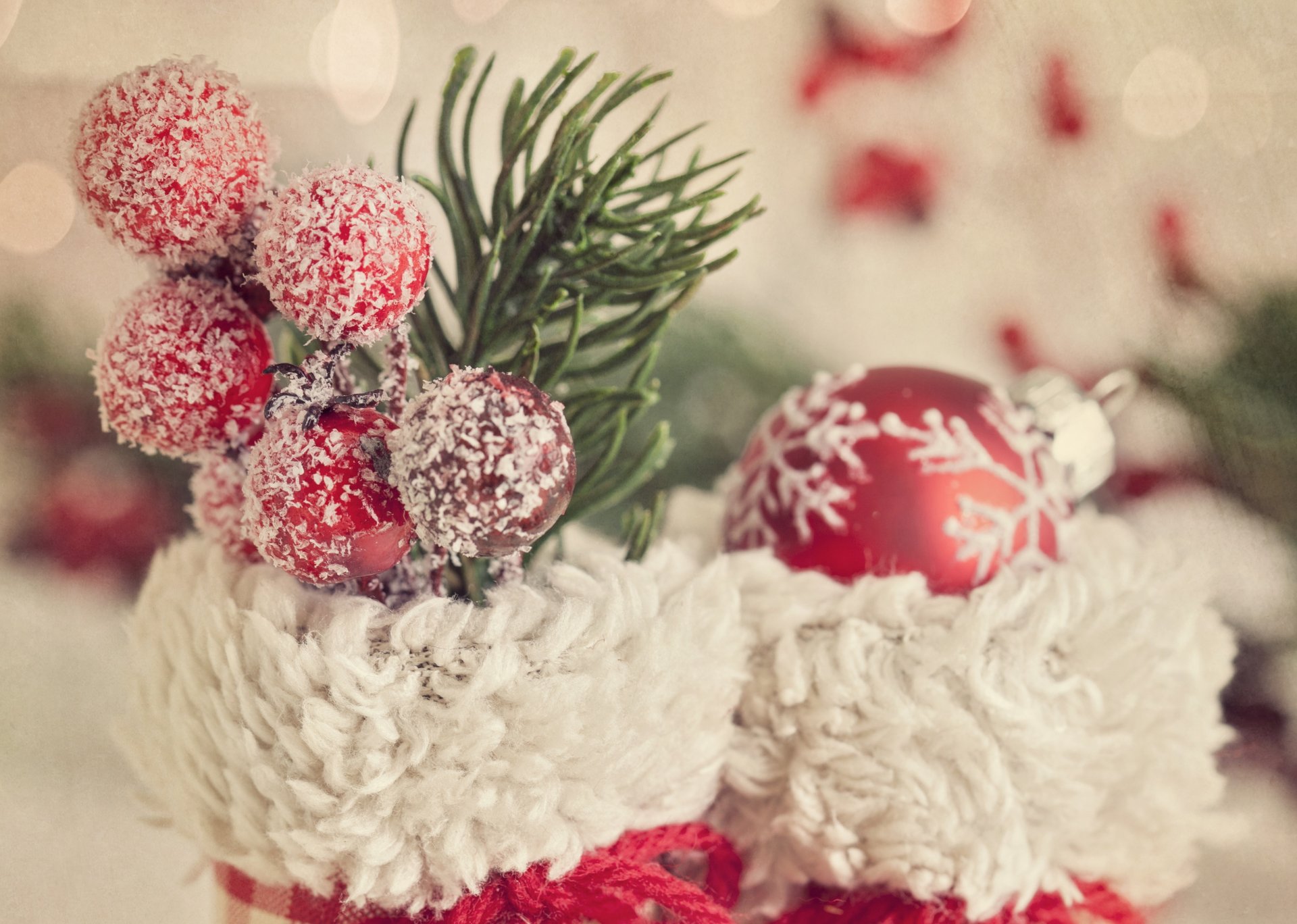 Botas rojas y blancas para navidad adornadas con bayas, ramita y bolaBotas rojas y blancas para Navidad adornadas con bayas, ramita y bola