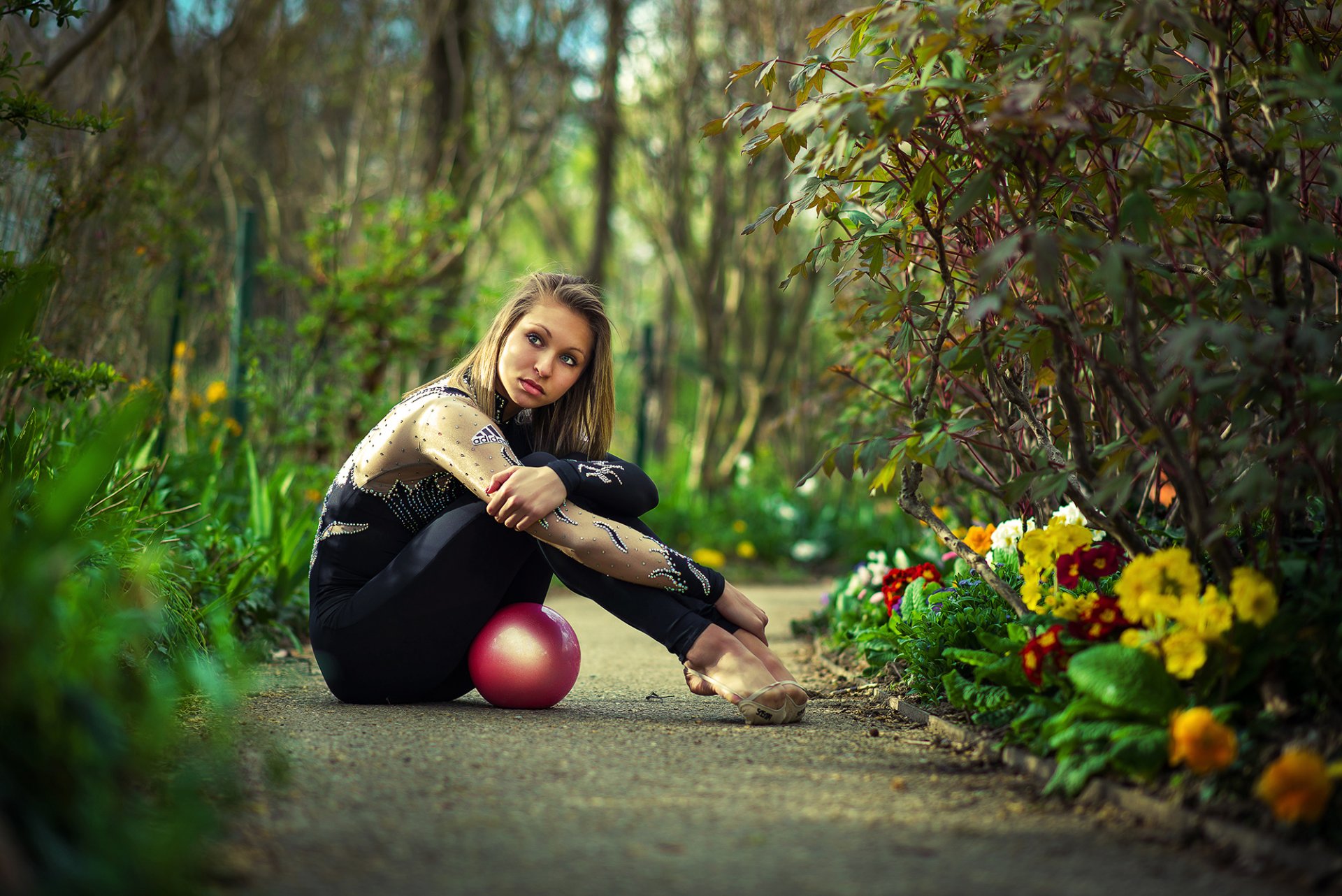 Foto de una gimnasta rítmica con una pelota en el Jardín