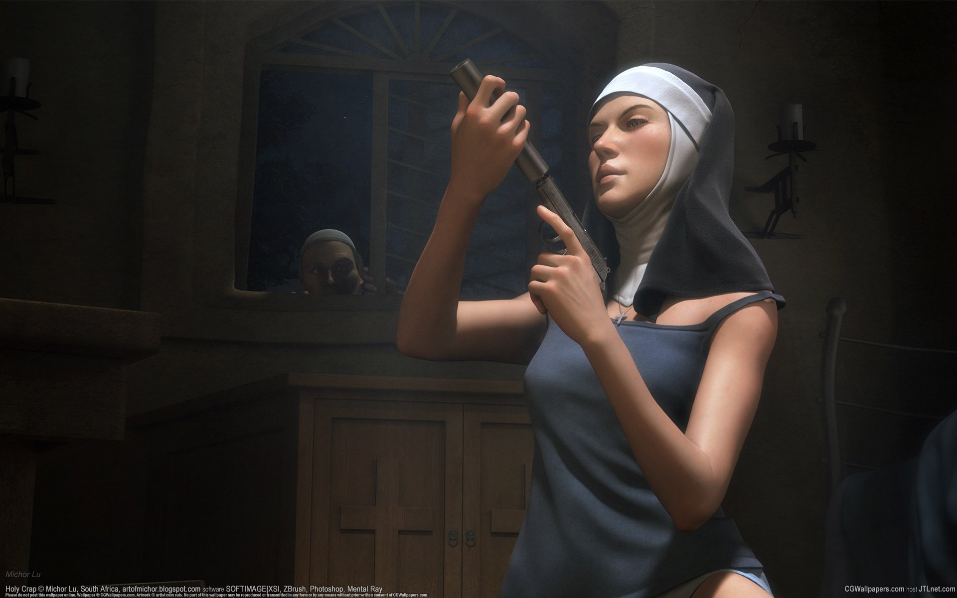 Una chica con una camiseta y un tocado de monja, con una pistolaUna chica con una camiseta y un tocado de monja, con una pistola
