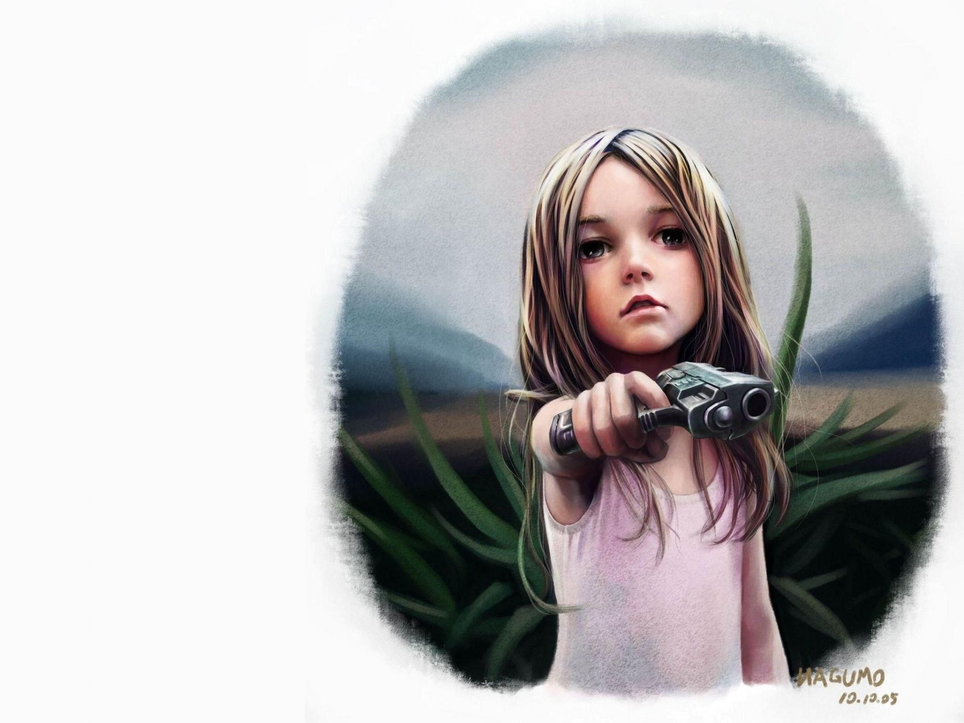 Mujer asiática con una pistola cerca de una pared de ladrilloMujer asiática con una pistola cerca de una pared de ladrillo