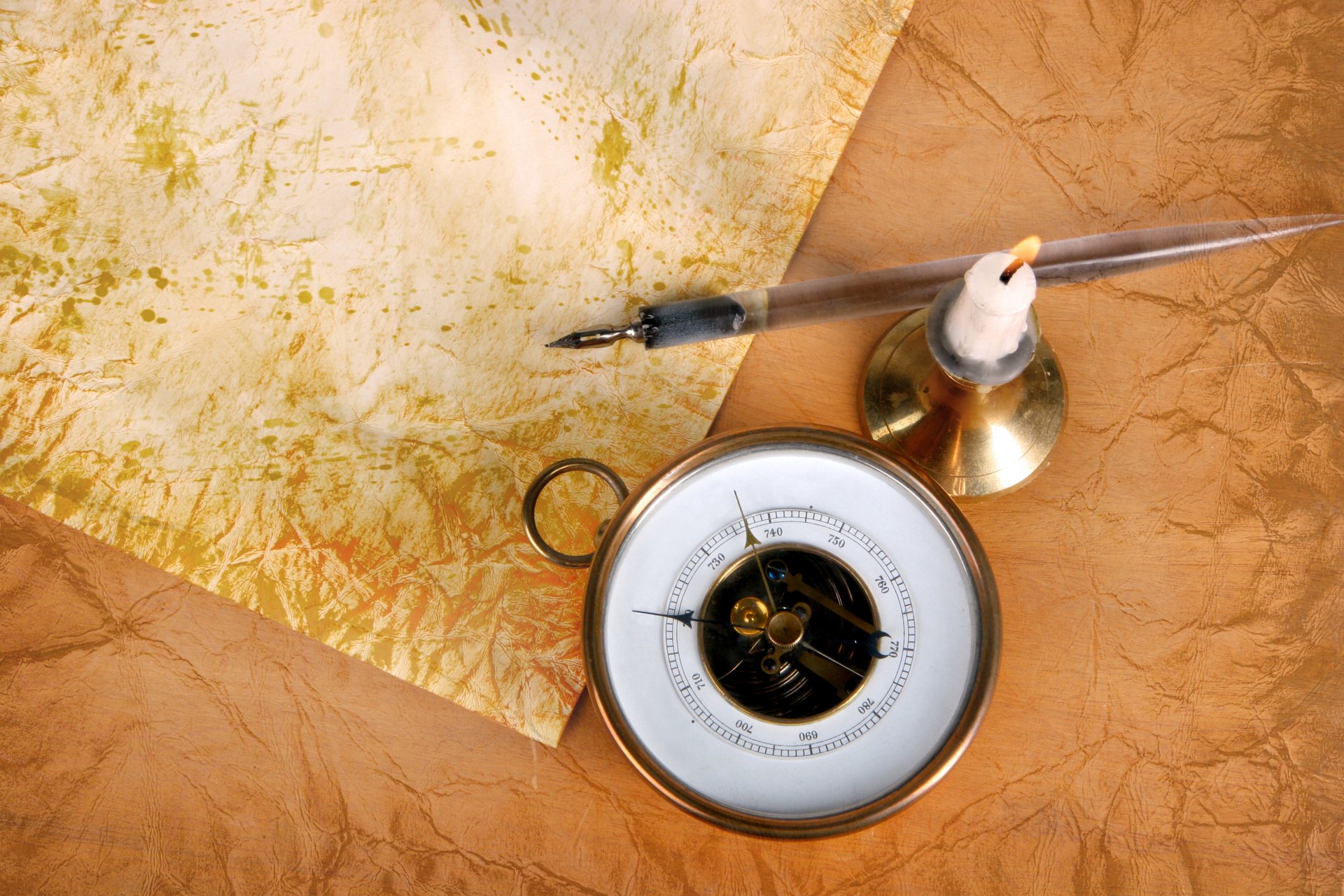 Brújula, candelabro con vela encendida y papel con mangoBrújula, candelabro con vela encendida y papel con mango