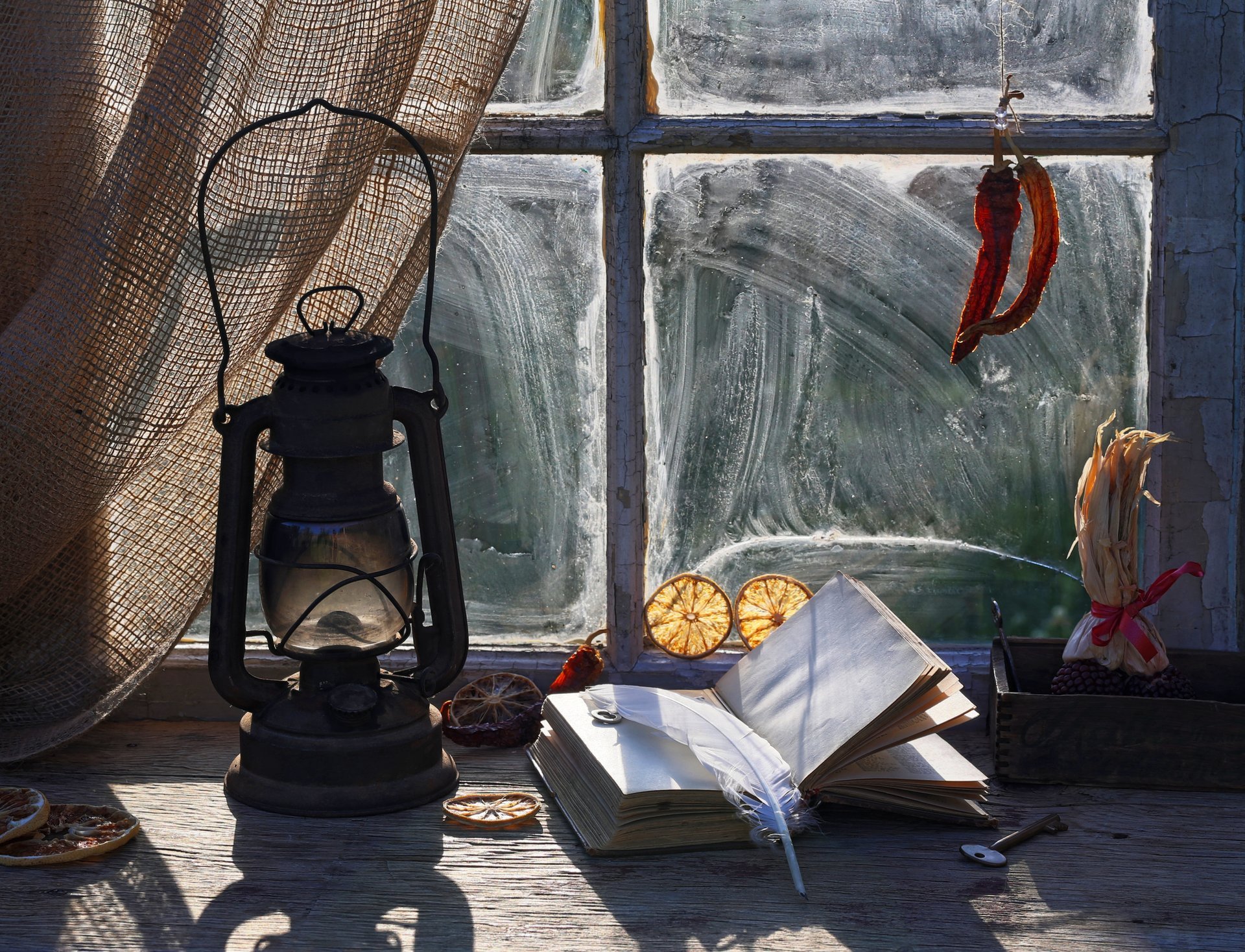 Libro de pluma y lámpara de queroseno en el alféizar de la ventanaLibro de pluma y lámpara de queroseno en el alféizar de la ventana