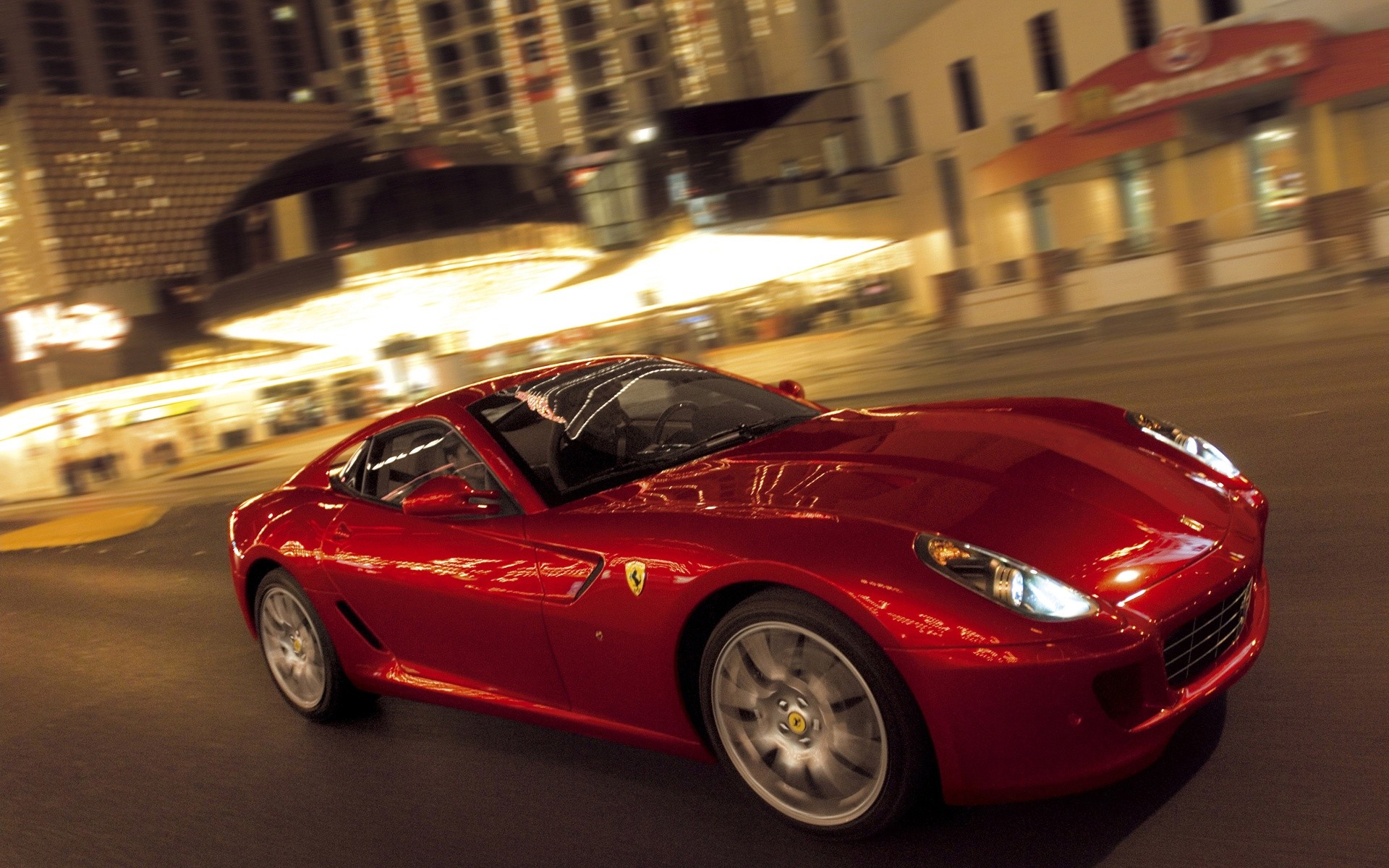 Coche rojo en movimiento por la ciudad de la nocheCoche rojo en movimiento por la ciudad de la noche