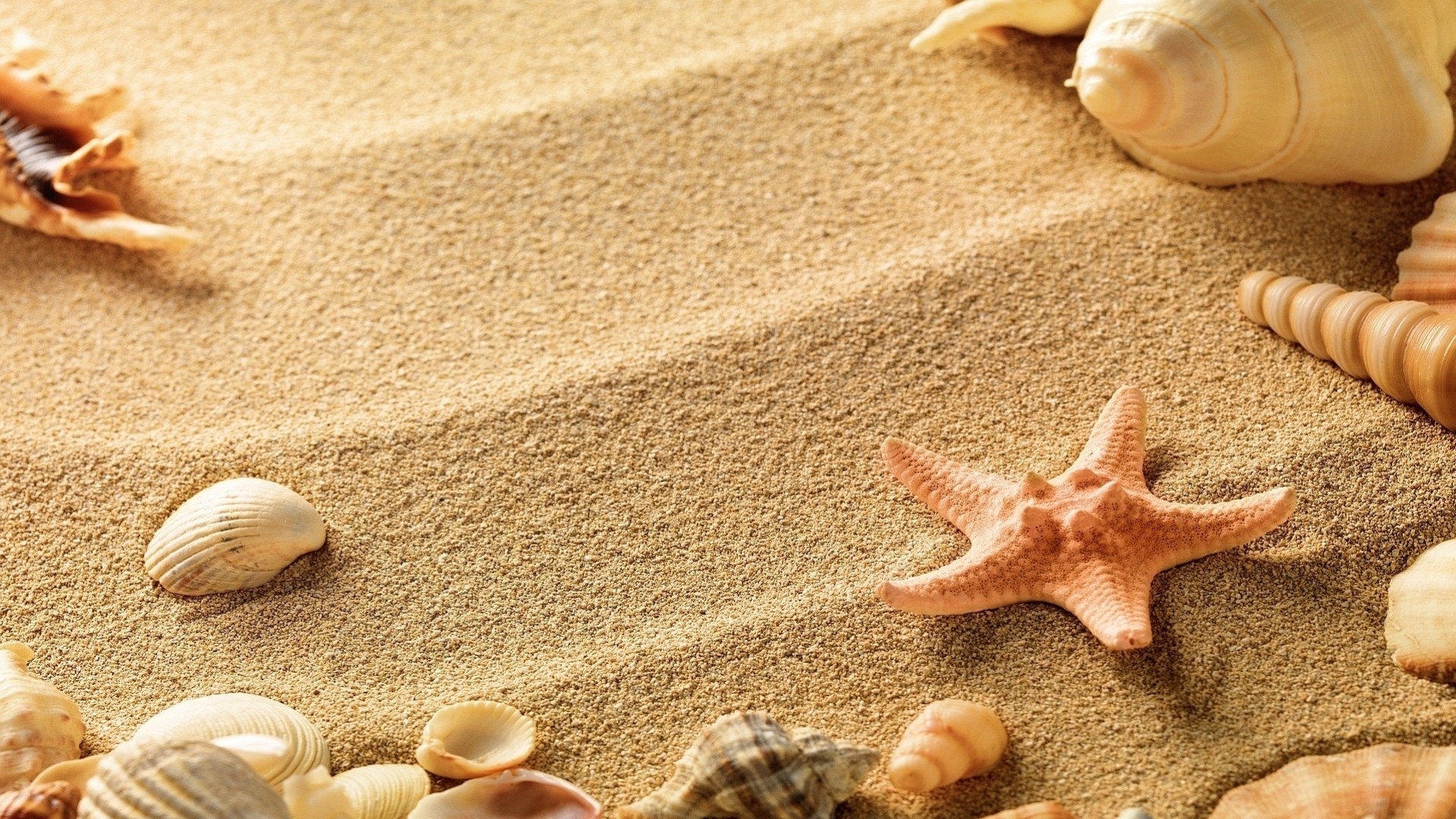 Conchas y estrellas en la orilla de la playa de arenaConchas y estrellas en la orilla de la playa de arena