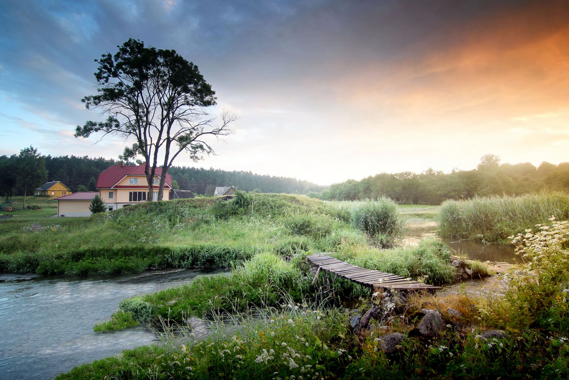 Amanecer y niebla a orillas del río del pueblo