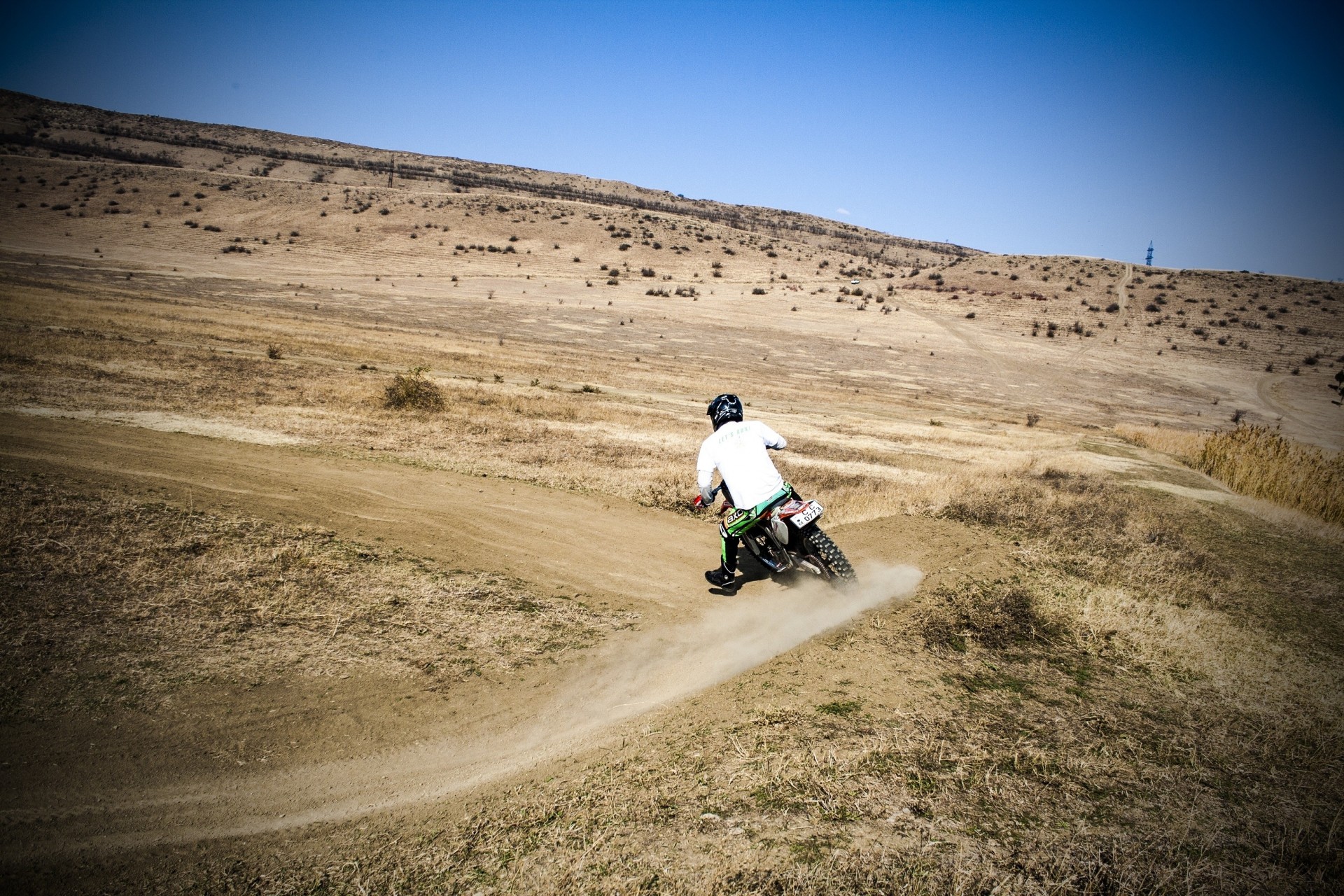 Un motociclista en una moto corre a través de los campos y bosques con seguridad a su señora de un pueblo cercano