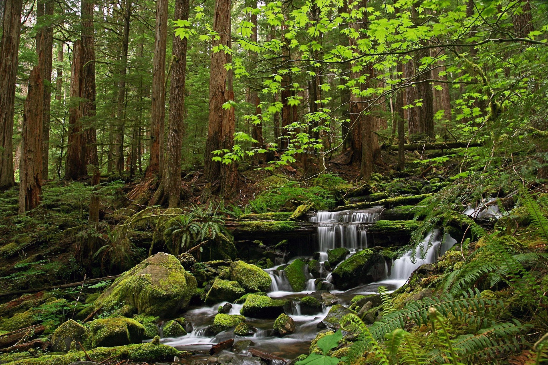 Paisaje con cascada y bosque alrededor de las montañasPaisaje con cascada y bosque alrededor de las montañas