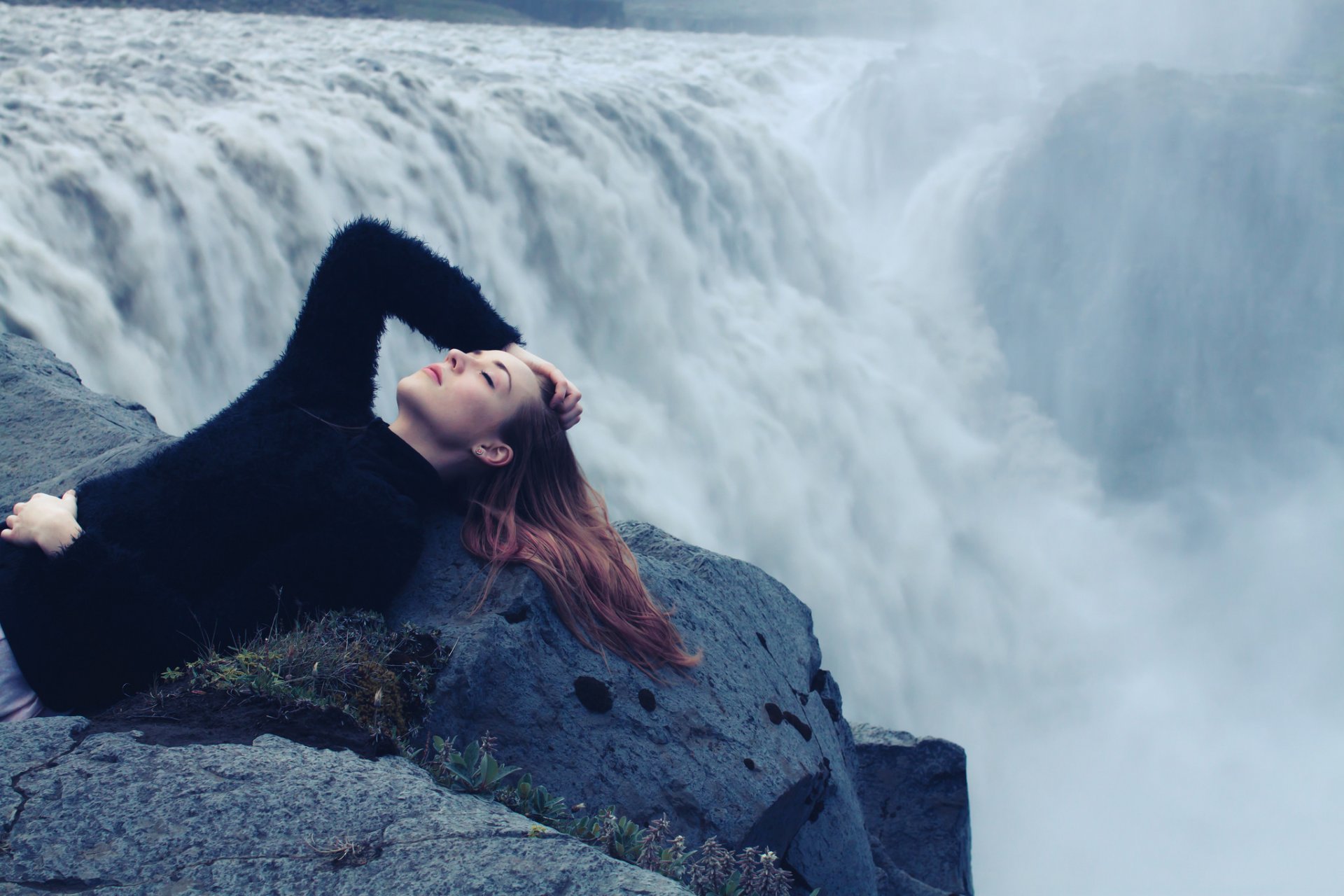 Cascada desde un acantilado entre árboles y matorrales de musgo